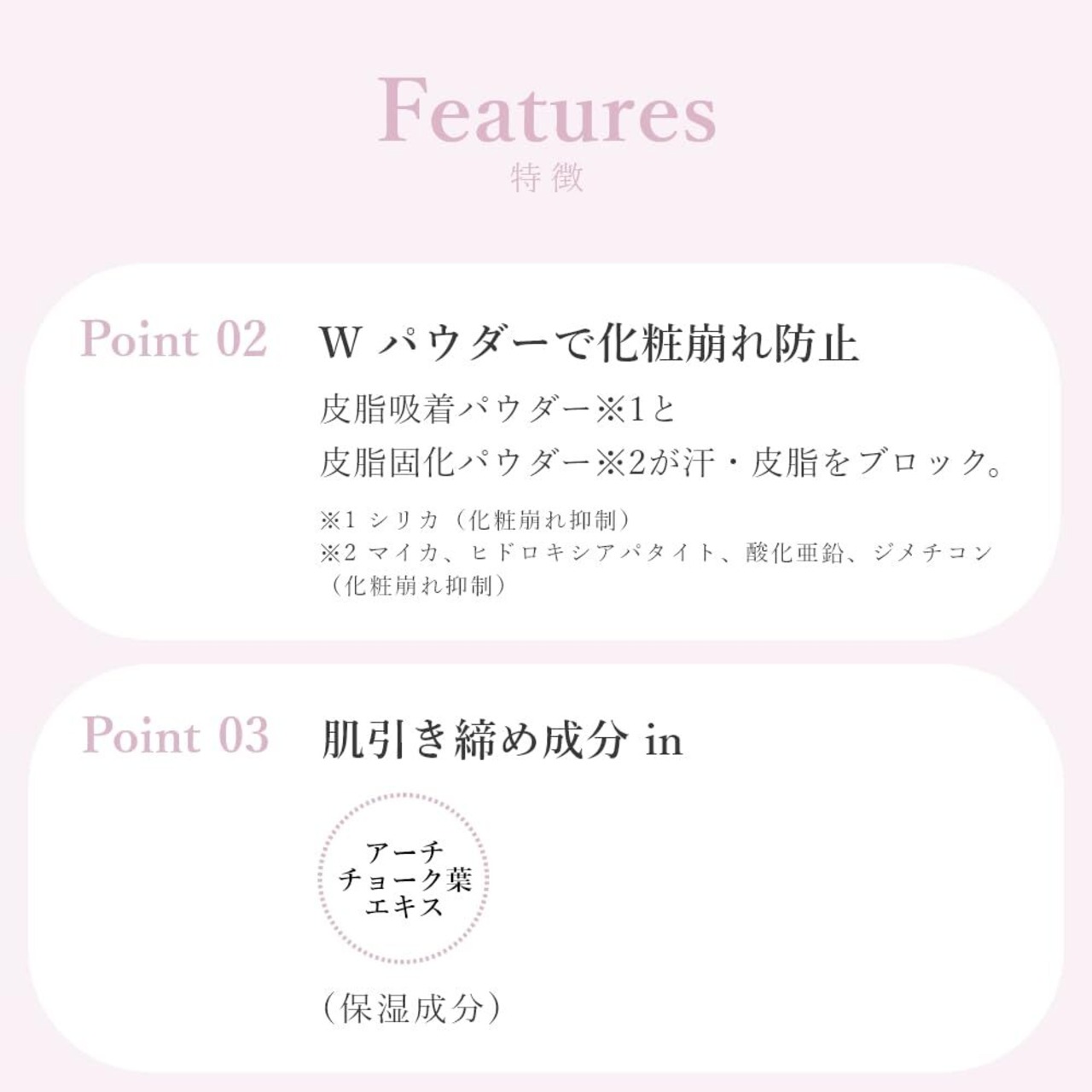 保湿クローズベール お肌に潤いを与え、メイクをしっかりキープ。 うるおいしながら使えるので、メイク時の乾燥にもおすすめです。 ●メイク崩れ防止Wパウダー ●油吸着パウダー*1と油性硬化パウダー*2が汗や油分をブロック。 1シリカ(化粧抑制)*2 マイカ、ヒドロキシアパタイト、酸化亜鉛、ジメチコン(メイク落ち防止) 土踏まずチョーク葉エキス(保湿成分)中の肌調成分
