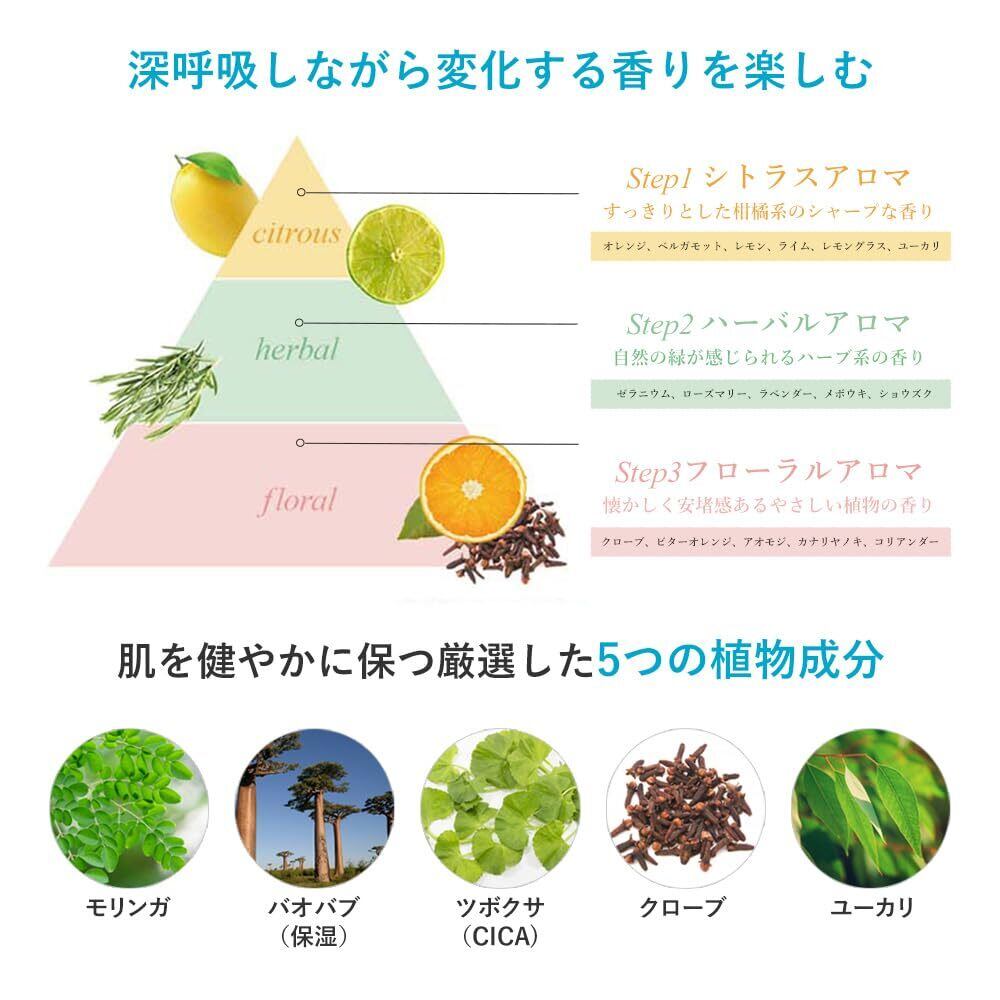 5つのフリー処方でありながらも、肌と心を同時にケアしたいという想いからやさしい植物の香りを採用。合成香料を使用せず、エッセンシャルオイルを使用しています。
