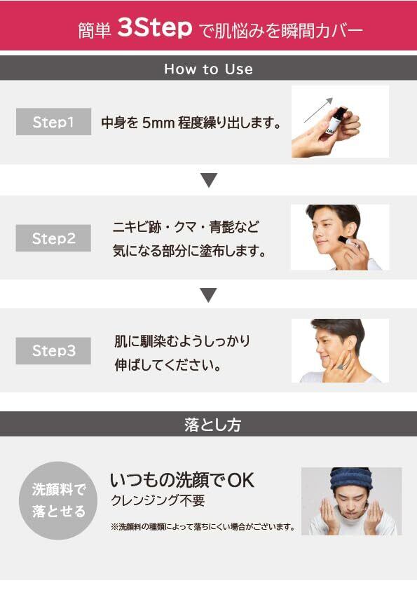 商品特長 簡単に肌悩みを隠す 毛穴 ニキビ跡 クマ 青髭 肌色 好印象な顔に仕上げる スティックタイプで直接塗るだけ ナチュラルな仕上がり 洗顔料で落とせる SPF47PA++++