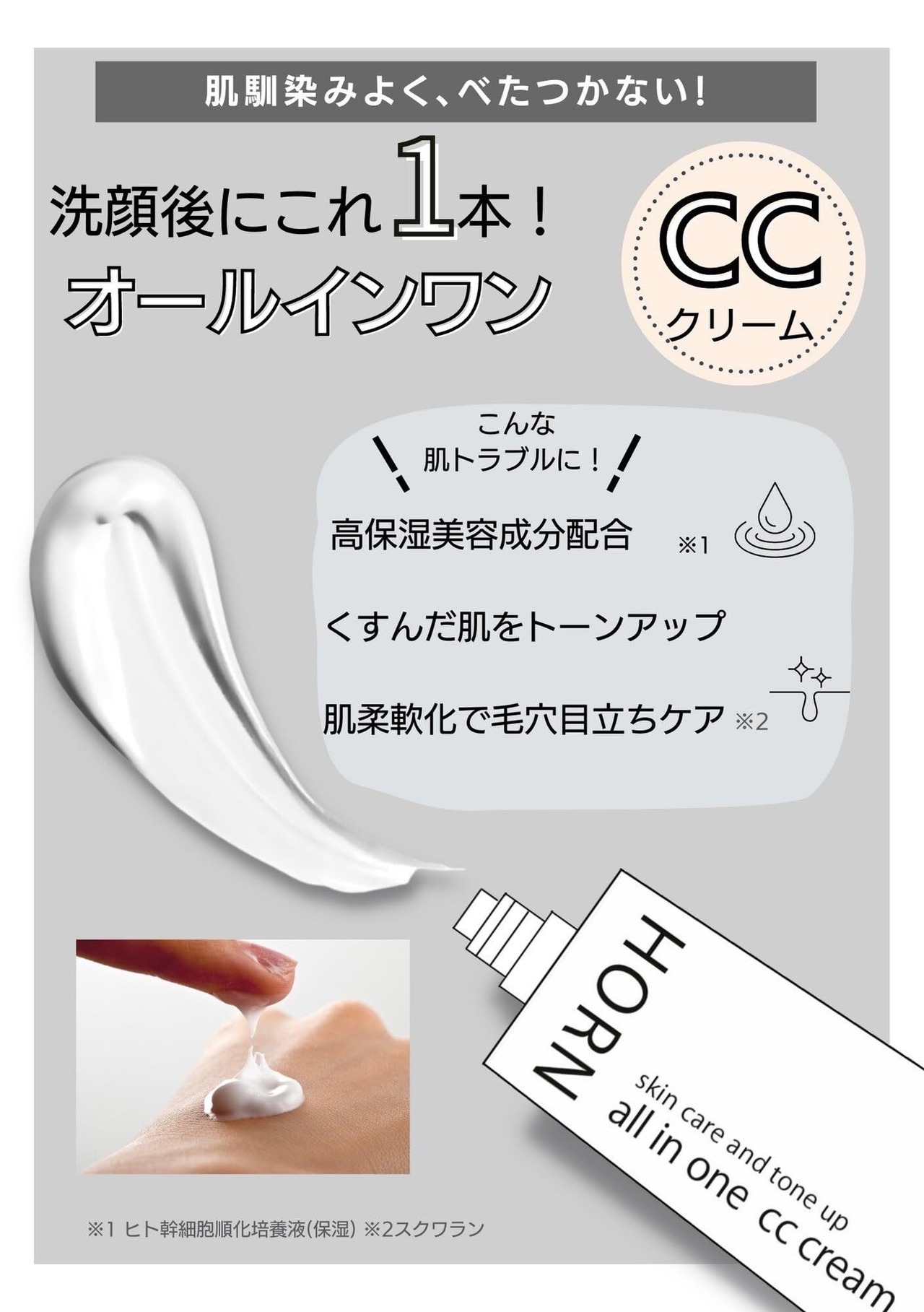 【商品の特徴】これ1本で5役(化粧水、乳液、クリーム、美容液、化粧下地)。 HORNオールインワンCCクリームを塗ることで肌に潤いと栄養を与える美容液の効果も得られるので、 夜寝る前、洗顔の後につけてもらうとしっかりと寝てる時に栄養が浸透するのでおすすめです。時間がない時は洗顔の後、化粧水、乳液の代わりにこのCCクリームだけつけてもらっても良質なお肌ケアが可能です。また、あからさまに塗った感が出なくてとてもナチュラルで、自然に肌のくすみや肌荒れなどをカバーしてくれます。