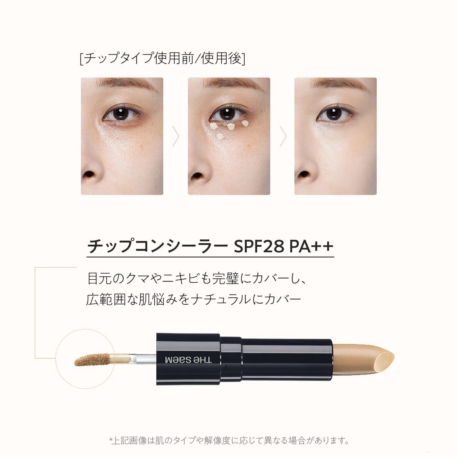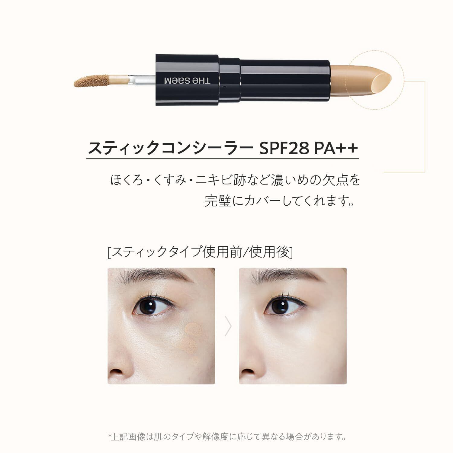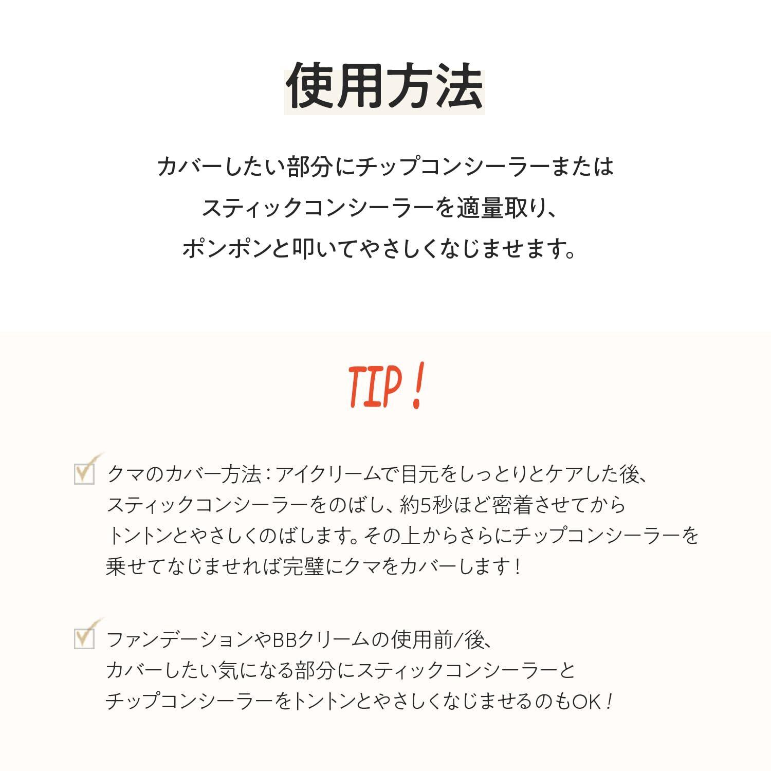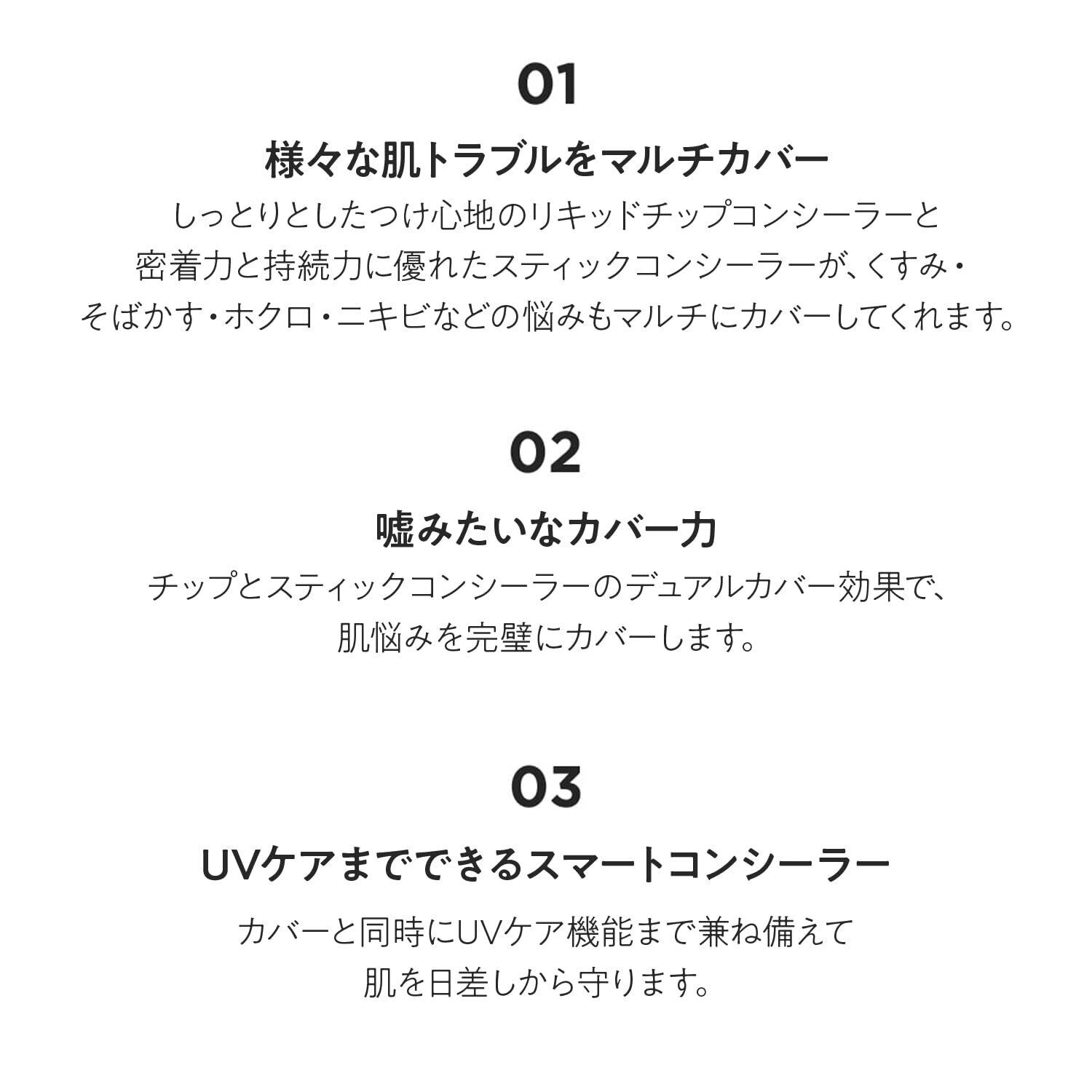 大人気のリキッドタイプのチップコンシーラーとスティックコンシーラーが1本になった2WAYタイプ。 2つのタイプのコンシーラーが強力なカバー力で欠点をケアするデュアルタイプコンシーラーです。 クマやシミ、様々な肌トラブルをマルチにカバーします。ピンポイントにカバーしたい時はスティックタイプ、広範囲カバーしたい時はリキッドタイプがオススメです。 スティックタイプを塗布後、リキッドタイプを重ねるとよりカバー力を発揮します。