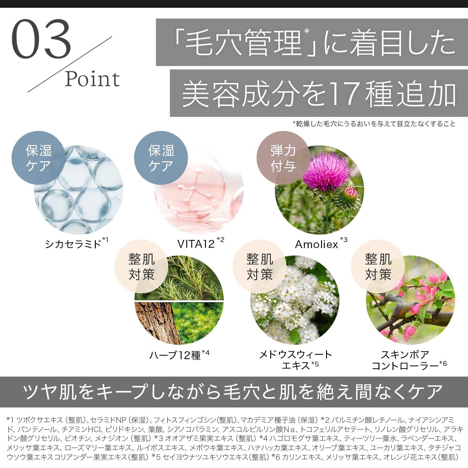 「毛穴管理」に着目した美容成分を強化。従来品に配合していた「毛穴管理*」メソッドに基づく美容成分に加え、新たに 17種の成分を追加。日中の肌と毛穴を守ります。*乾燥した毛穴にうるおいを与えて目立たなくすること