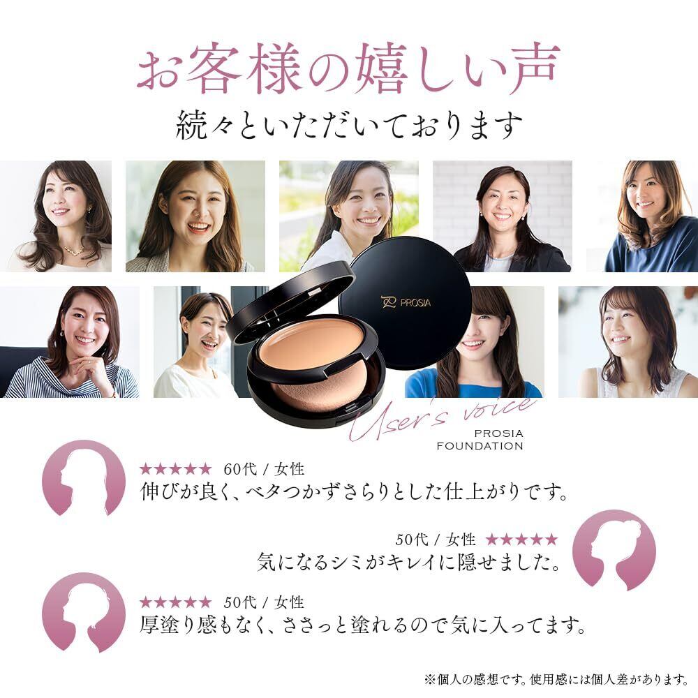 【使用方法】①お肌を清潔にし、基礎化粧品でお肌を整え、化粧下地をムラにならないようにのばしてください。②パフにファンデーションを適量含ませてください。含ませる際はパフを一方方向に軽く滑らせるようにしてください。③お顔にのばす前に手の甲にのばして試しぬりしてください。※パウダータイプと違い、たくさんつきますので加減しながら使用してください。④お顔の「しわになりにくい部分」からのばしていくと自然な美しさに仕上がります。頬→鼻→額→口周り→目元⑤細かい部分はパフの角を使って丁寧にのばしてください。【シミ・そばかす・クマ・くすみ等をカバーしたい場合】①指先にファンデーションを取り、気になる部分にトントンとたたくようになじませます。②パフにプロシアファンデーションを軽く含ませ、上からなじませます。※個人差によりカバー効果が十分に現れないことがございます。