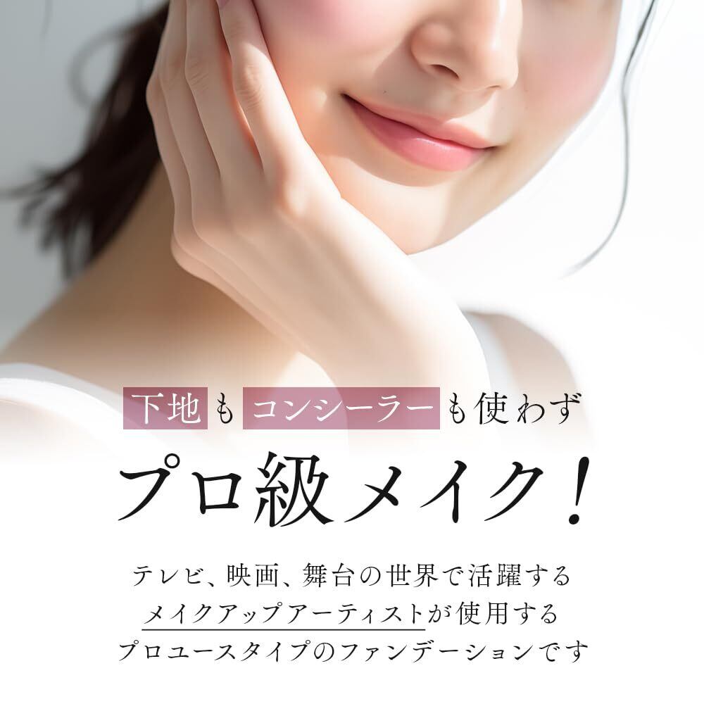 【自然な仕上がりで、シミをカバー】下地もコンシーラーも使わずプロ級メイク!テレビ・映画・舞台の世界で活躍するメイクアップアーティストが使用するプロユースタイプのファンデーション。カバー力が高く、気になるシミ・くすみをしっかりカバー。重ね塗り自由自在なので、立体感のある顔に仕上げたり、薄くつけて透明感のある素肌感覚の仕上がりに。
