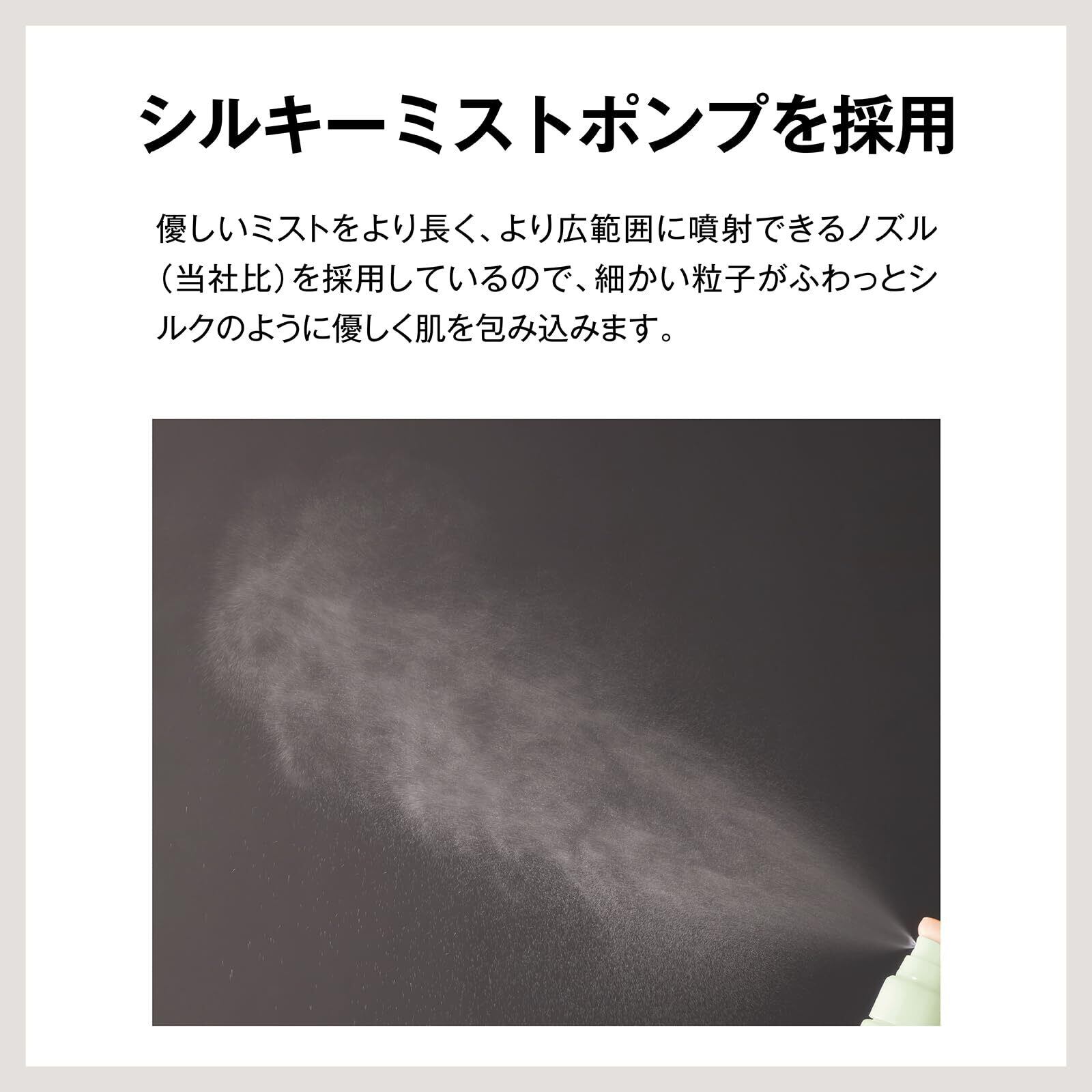 優しいミストをより長く広範囲に噴射できるノズル(当社比)を採用し、細かい粒子がふわっとシルクのように優しく肌を包み込みます。