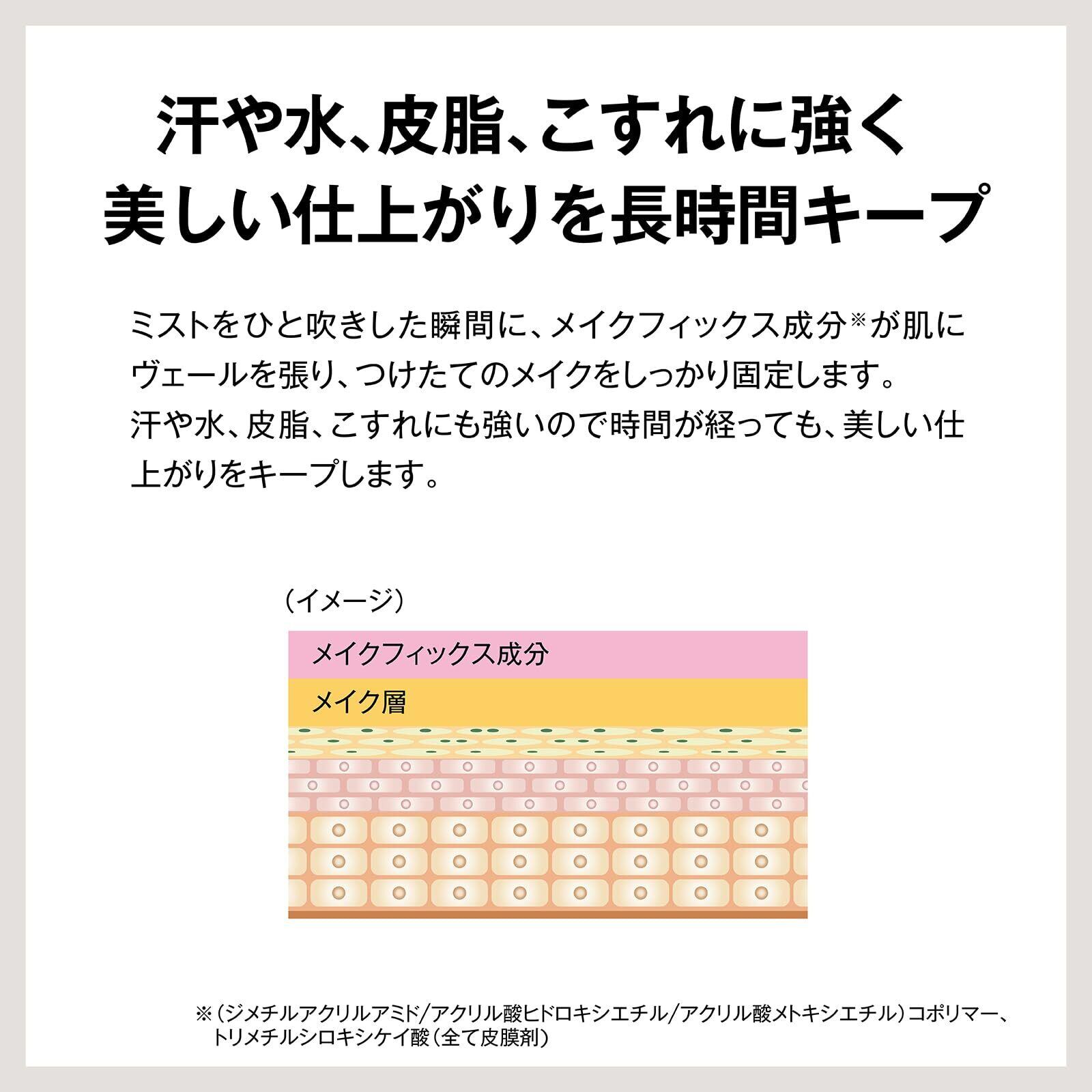 メイクの仕上げにシュっと、ひと吹き!つけたてのメイクを崩さないフィニッシングミスト 心やすらぐホワイトティーの香り 商品特徴 ① 汗や水、皮脂、こすれに強く 美しい仕上がりを長時間キープ ミストをひと吹きした瞬間に、メイクフィックス成分*1配合のきめ細かいミストが肌にヴェールを張り、崩れの原因を防いでつけたてのメイクをキープします。 汗や水、皮脂、こすれにも強いので時間が経っても、美しい仕上がりをキープします。 ②モイスチャーバランスを整えて 化粧崩れを防ぐ 肌の水分と皮脂のバランスが乱れた肌は、化粧崩れしやすくなります。メイクアップフィックスミストは、モイスチャーバランスに着目。 スキンケア効果*2で肌の水分と皮脂のバランスを整え、化粧崩れを防ぎます。 *1・・・(ジメチルアクリルアミド/アクリル酸ヒドロキシエチル/アクリル酸メトキシエチル)コポリマー、トリメチルシロキシケイ酸(すべて被膜剤) *2・・・ユキノシタエキス(引きしめ成分)、ダイズ種子エキス(整肌成分) 使い方 メイクの最後にお使いください。 ボトルを5~10回ほどよく振ってから、目と口を閉じ、顔から20cm程度離して顔全体にムラなくスプレーしてください。 スプレー後は、肌に触れず、そのまま乾かしてください。