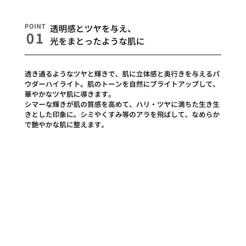 【こんな方・こんな時に特にオススメ】●ツヤ肌に見せたい方 ●肌なじみのいいパール感が欲しい方 ●肌に立体感や奥行きが欲しい方 ●マスクメイクでさらっとした使用感のハイライトをお探しの方 ●石鹸で簡単にメイクオフしたい時