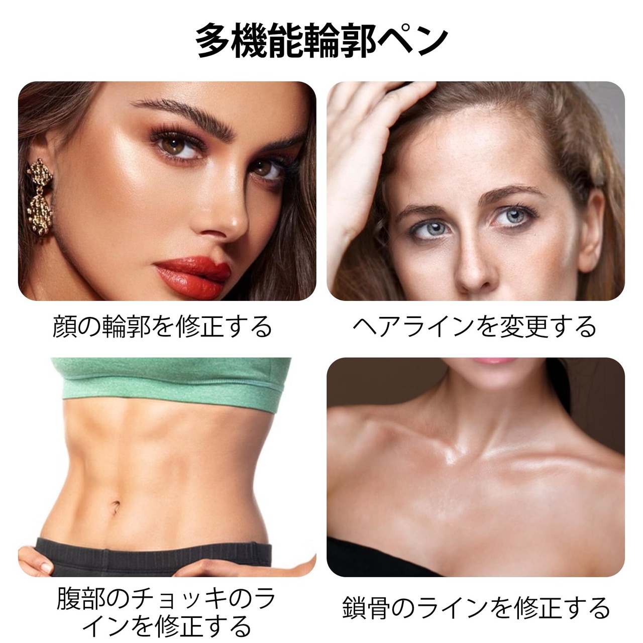簡単な使用方法:ハイライトチップで鼻筋、額、顔のハイポイントに塗り、輪郭の毛先で髪の生え際や顔の側面に影をつけます。指やブラシで優しくブレンドすることで、マットで洗練されたルックが完成。