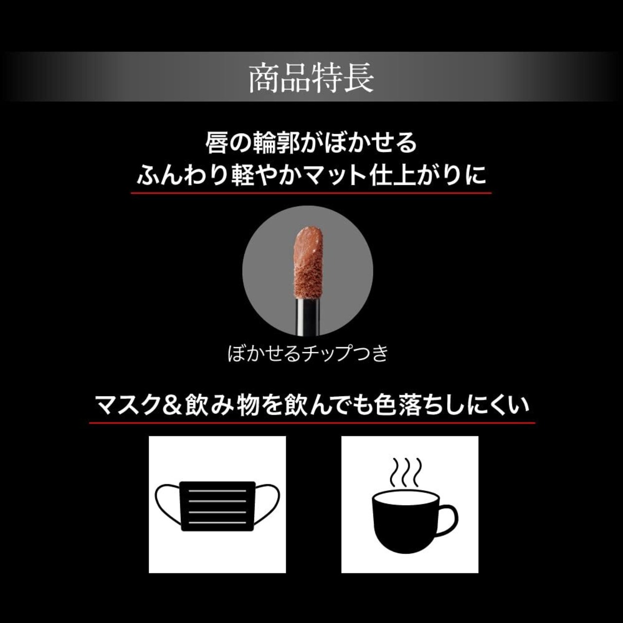 つけたての色が長時間持続 ふんわりマット質感に変化 落ちにくい液状リップ ■高発色スフレ処方:唇から蒸発する水分を活用してしっとりジェル膜へ変化 液状リップの油分が揮発してふんわりマット質感に変化 ■リップモンスターの機能を踏襲 つけたそのままの色が長時間持続 マスクをしても色落ちしにくい 飲み物を飲んでもカップにつきにくい ■全5色