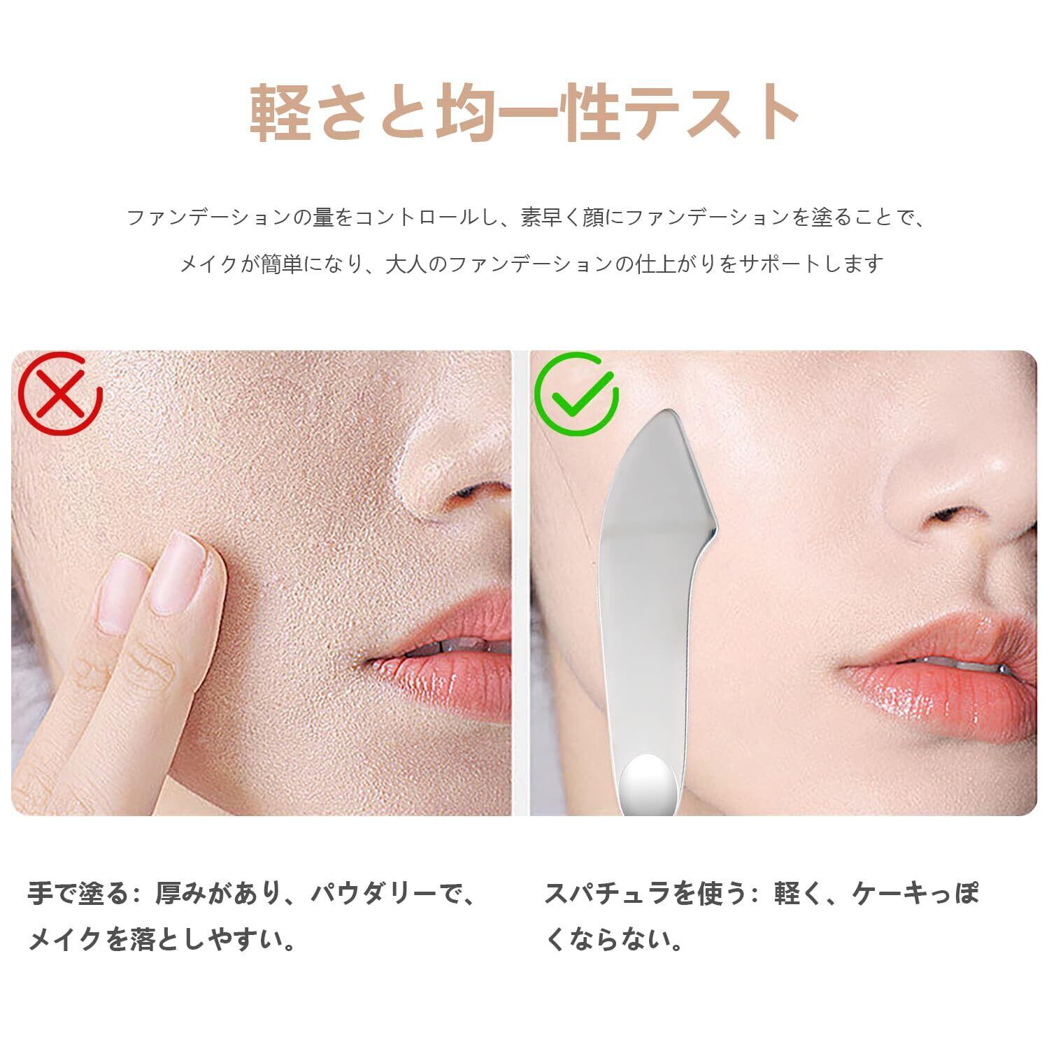 【こだわり設計】スパチュラの表面がなめらかで、ファンデーションをよくのばせる! なめらかなデザインで、肌を傷つけません。使い方は簡単で、特別なテクニックは必要ありません。スパチュラの端が2種類あるので、自分に合った端が選べます。