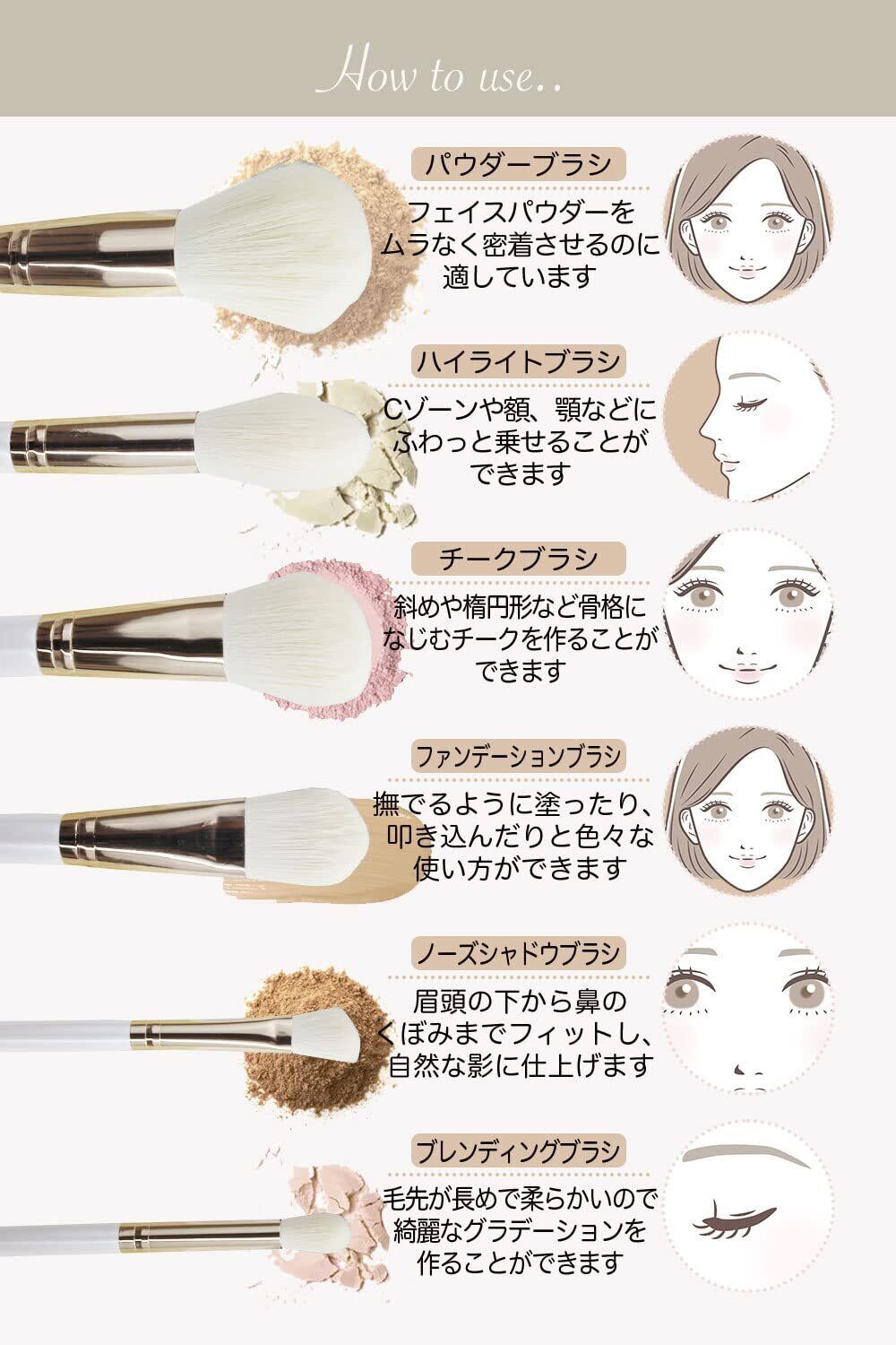 【粉含みのよい毛質とお手入れがしやすい毛】人工毛(ナイロン製)を使用。粉飛びが少なく、豊富に粉を含み、肌へのせることができます。パウダーやクリーム状、液体状に使え、お手入れは、ぬるま湯での洗い流しやメイク専用洗剤などで奥まですっきり洗い流せ、タオルドライ後、陰干し乾燥することができますので、清潔に永くお使いいただけます。【ホワイト&ゴールドデザイン】光沢のあるホワイトの木製の取手とゴールドのアルミ口管の取り合わせは、上品な雰囲気。お部屋の一角に置いていても気分をあげてくれるデザインです。お揃いのホワイトレザー調ポーチに収納し、バッグに入れて持ち歩くこともできるので、外出先での手直しに役立ちます。