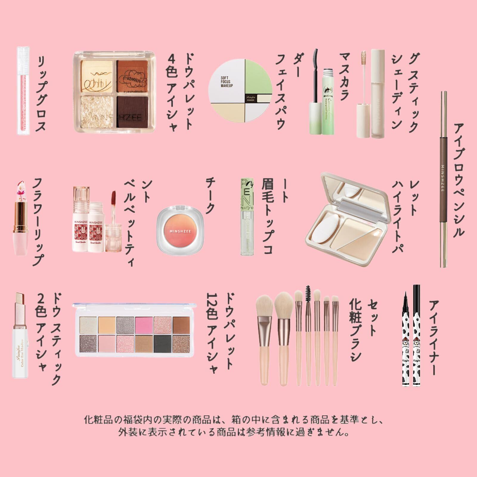 2024年限定コスメ福袋:人気の化粧品がたっぷりと詰まっています。リップグロス、アイライナー、口紅、アイシャドウ、マスカラなど、メイクに必要なアイテムが一式揃ったセット。初心者にも安心してお使いいただけます。新春やバレンタインのプレゼントとしても喜ばれ。