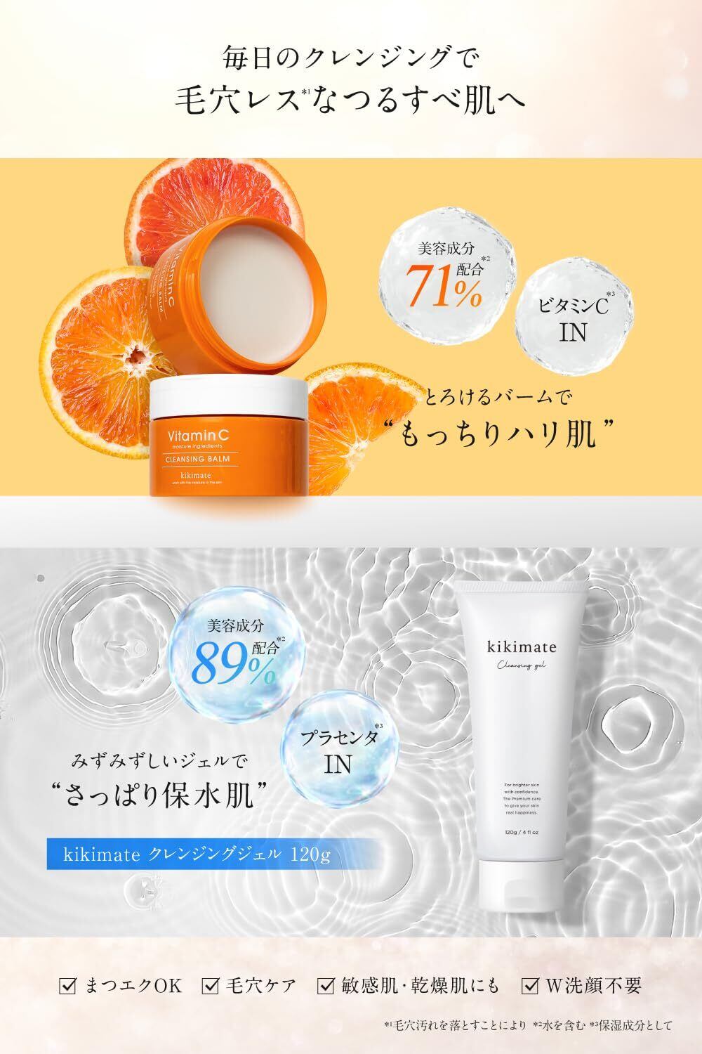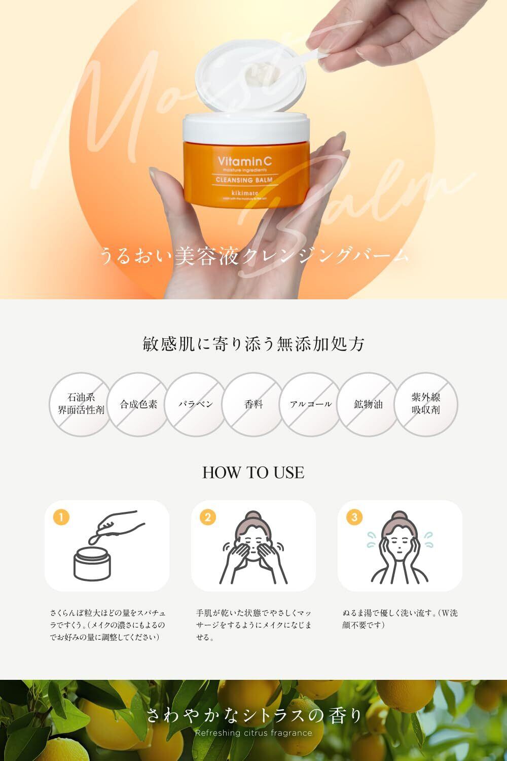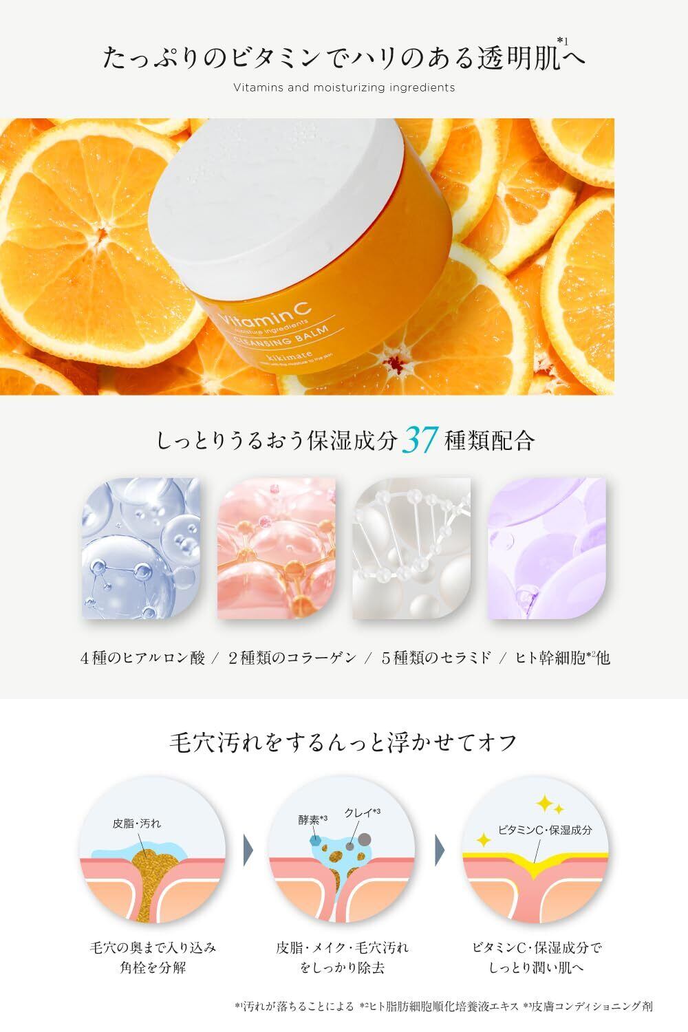 【ビタミンたっぷり9種類+植物エキス】「ナイアシンアミド*・パンテノール*を含むビタミン9種」+「CICA *・ドクダミエキス*・ティーツリー*」お肌に嬉しい成分がたっぷり。 毛穴ケアしながらもっちりハリのある透明肌*へ。 kikimateは乾燥肌・敏感肌・混合肌・脂性肌のすべての肌質の方にオススメです。(※保湿成分) (※汚れが落ちることによる) クレンジングオイル、クレンジングウォーター、クレンジングシート、クレンジングジェル、ふき取りメイク落としを使っててもイマイチしっくりとこなかった方、お肌に負担がかかりにくく潤い成分たっぷりのバームタイプを使ってみて下さい。