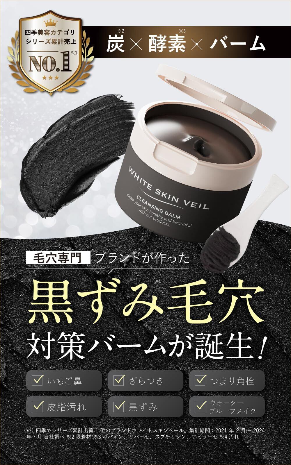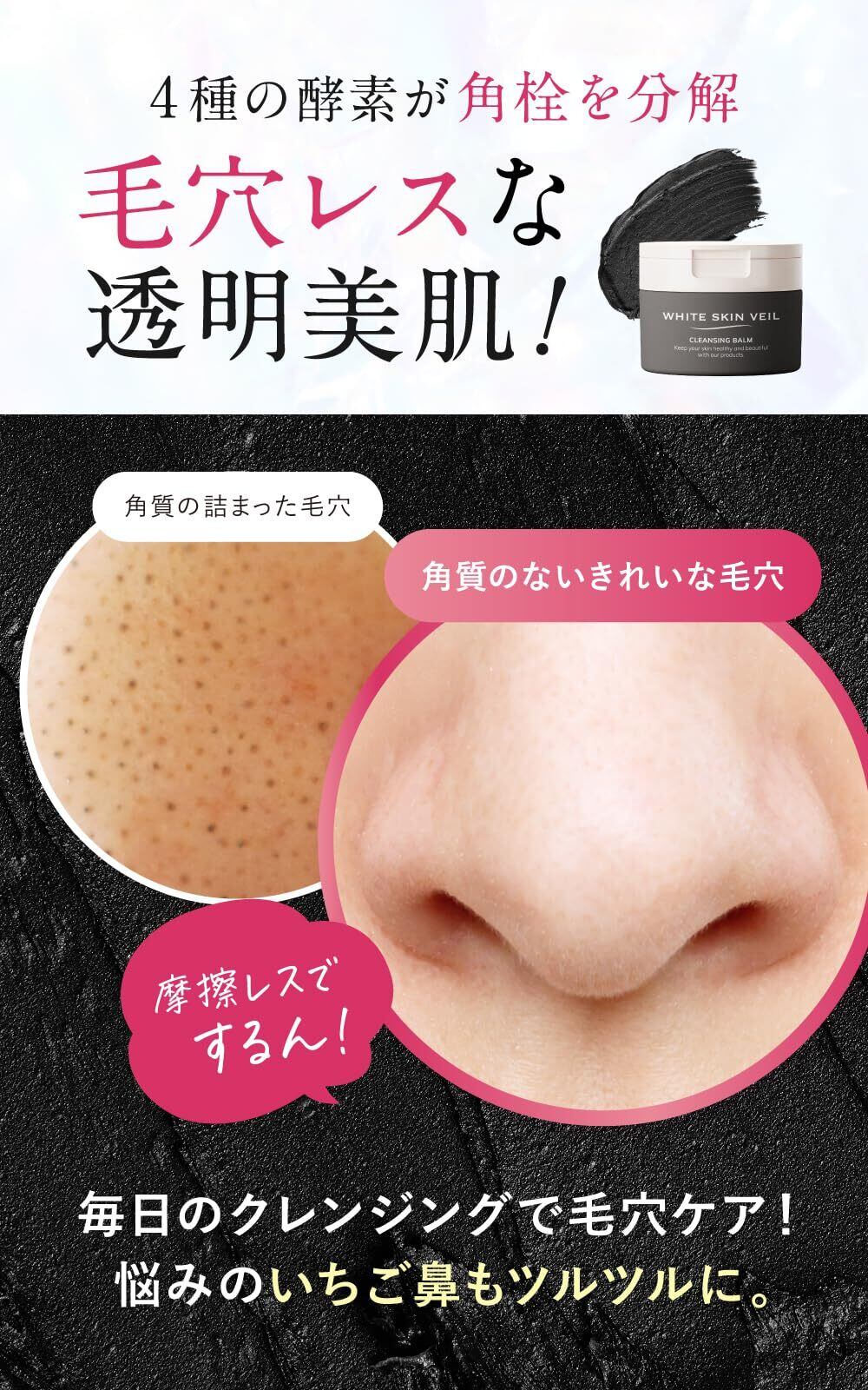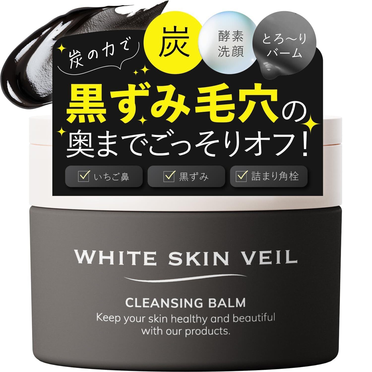 ✨【毛穴専門】毛穴ケアブランドのホワイトスキンベールが本気で作った毛穴 クレンジングバーム 黒。炭を配合したことで酵素の力もパワーアップ!w洗顔不要のクレンジングだから毎日のケアが楽に
