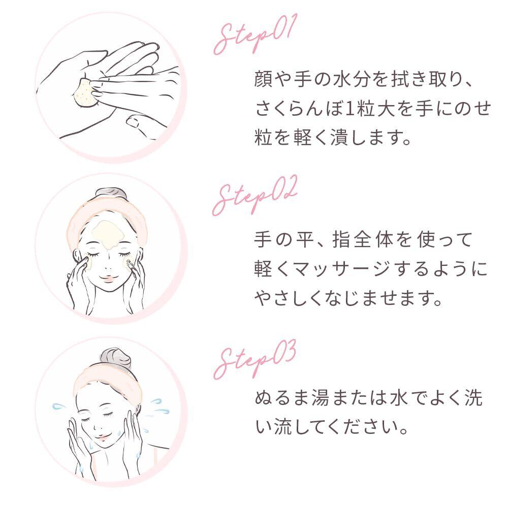 【使用方法】手のひらに適量(さくらんぼ一粒大)とり、やさしくマッサージするようにメイクとなじませます。その後、水またはぬるま湯で洗い流してください。