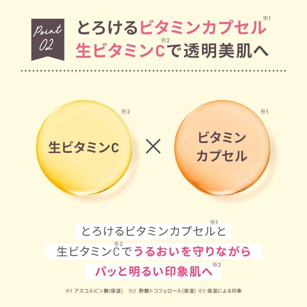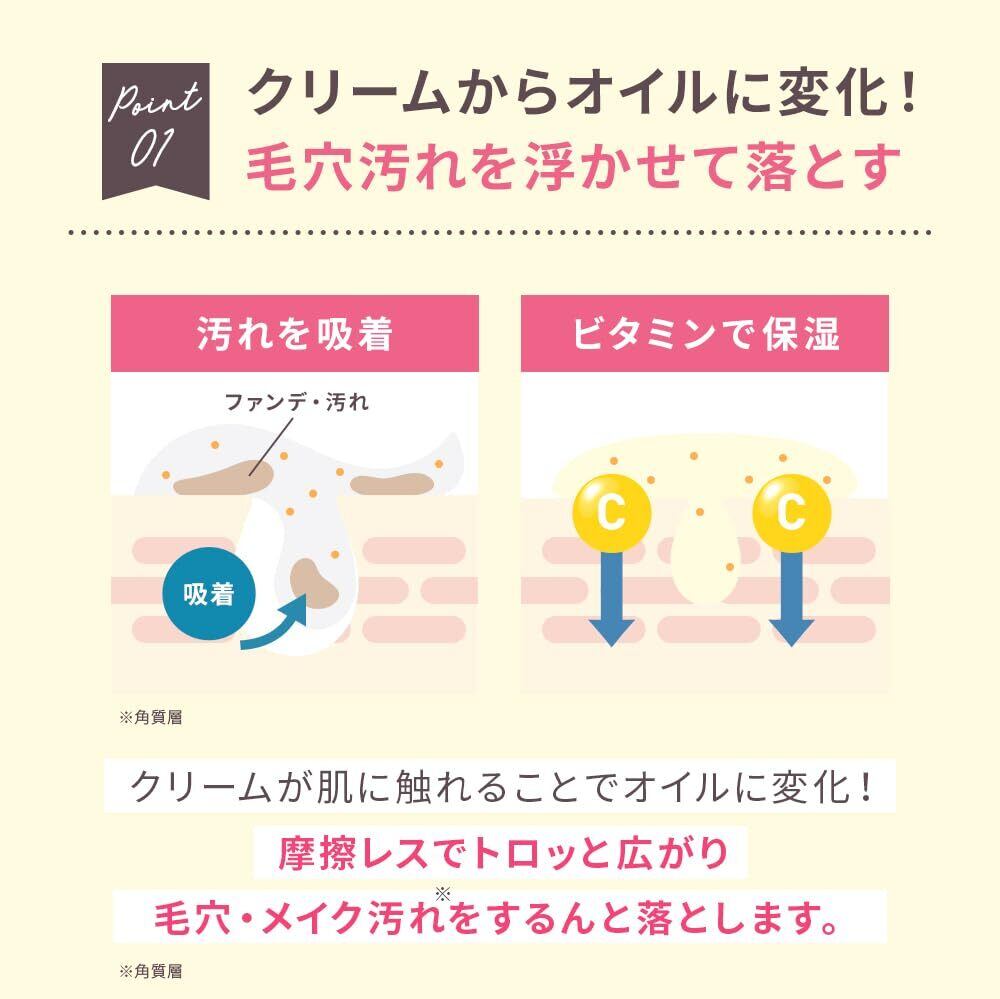 しっかり落としてうるおう生VC※1+ビタミンカプセル※2配合のクレンジング。クリームからオイルに変化!毛穴汚れを浮かせて落とします。摩擦レスでトロっと広がり、毛穴・メイク汚れをするんと落とします。まつエクOK。 ※1 アスコルビン酸(保湿成分) ※2 酢酸トコフェロール(保湿)