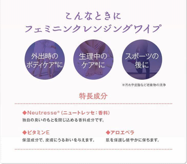 ウェットタイプのシートが、女性のデリケートな肌の気になる汚れをやさしくふき取り、外出時でもシャワーを浴びたようなフレッシュさを実感。保湿成分(グリセリン)も配合し、肌を乾燥から守ります。 ●アルコールフリーなのでデリケートなお肌にやさしいシート。 ●個包装なので携帯に便利で衛生的。 よりシンプルで、低刺激な新処方に生まれ変わりまし