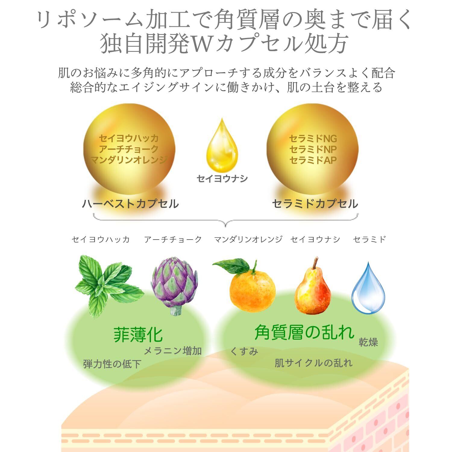 【独自開発のWカプセルによるアグリビューティ発想】マンダリンオレンジ、セイヨウハッカ、アーチチョークの3つの植物エキスと3種のセラミドを配合したリポソーム加工のWカプセルで角質層の奥まで届け、お肌の肌荒れを防ぎハリ・ツヤを与え、しっかり保湿します。