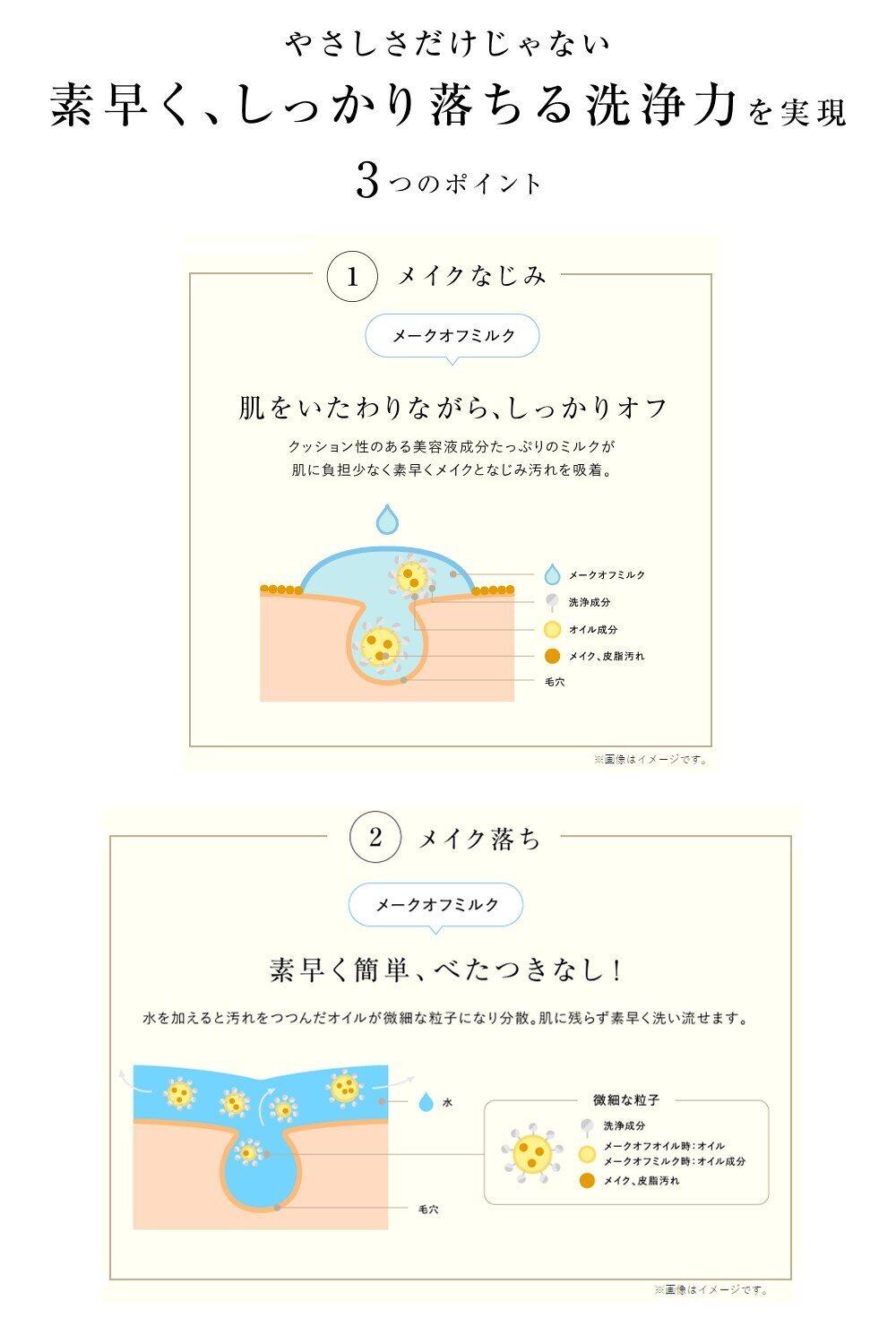 肌あれの時だって。やさしいのにすっごく落ちる。肌をいたわりながらしっかりオフするまろやかなクレンジングミルク。みずみずしくなじみ、メークや毛穴の汚れをつつみ込み、べたつきのないやわらかな肌に洗い上げます。クッション性のある水分ベースのミルク。肌にやさしいのに、しっかり落ちる、高洗浄ミルクです。肌にやさしい米ぬか油配合。皮脂に近い組成の肌なじみのよい天然オイルを使用。肌に心に心地よい香りの精油をブレンド。一日を過ごした肌や心をリフレッシュ。(ベルガモット、ゼラニウム、スイートオレンジ)敏感肌でも使える低刺激設計。無着色、弱酸性、合成香料*1・アルコール・鉱物油・防腐剤(パラベン)無添加 敏感肌の方のご協力によるパッチテスト済み アレルギーテスト済み ※すべての方にアレルギーや皮ふ刺激が起きないというわけではありません。 *1 香りは精油によるものです。【商品パッケージ仕様変更のお知らせ】環境に配慮した仕様の商品パッケージに順次移行いたします。【変更点】化粧箱:開封防止タイプ、素材:環境配慮素材、 封緘:シール廃止 【切替予定時期】2024年5月下旬~順次切り替え