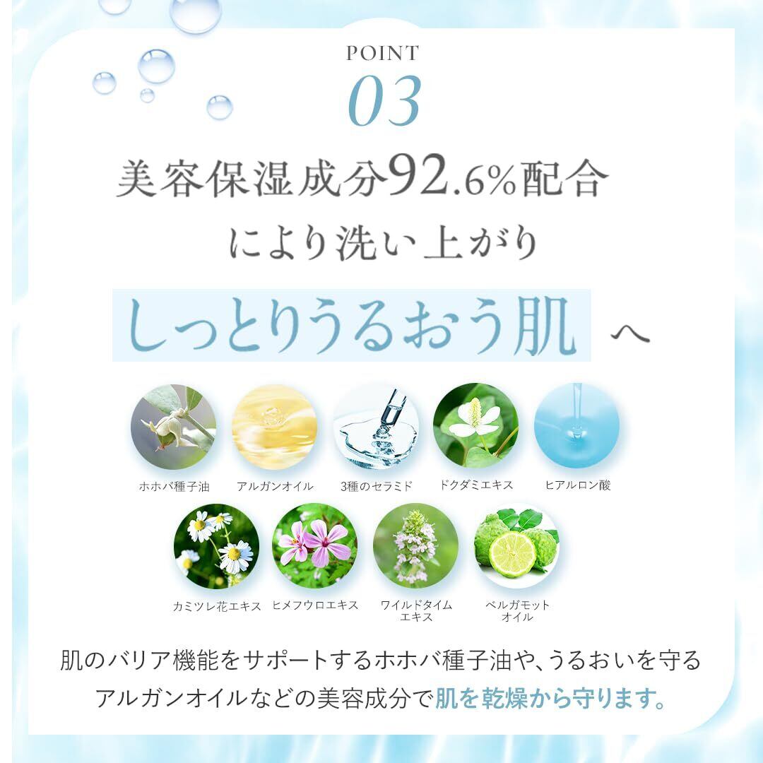 ポイント3:美容保湿成分92.6%配合!洗い上がりしっとりなめらか肌へ。肌のバリア機能※1をサポートするホホバ種子油や、うるおいを守るアルガンオイルなど、31種類の美容成分を配合。洗い上がりの肌をしっとりと包み込み、くすみ※2の原因にもなる乾燥から肌を守ります。 ※1 角質層 ※2 汚れや古い角質による