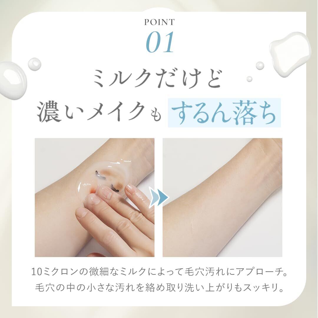 ポイント1:ミルクだけど濃いメイクもしっかりオフ。「モイストクレンジングミルク」は、メイクとスルッとなじむ、数種類のオイルを使用しました。 ファンデーションはもちろん、アイライナーやマスカラなどのポイントメイクもするんと落とします。