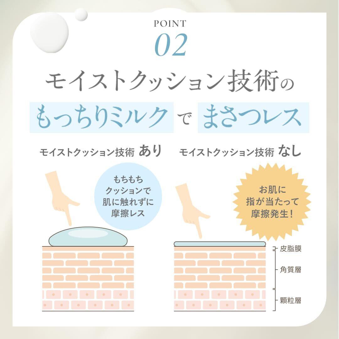 ポイント2:モイストクッション技術のもっちりミルクでまさつレス。濃密でもちもちとした弾力のあるリッチな感触のモイストクレンジングミルクは、まさつレスでメイクをオフできます。 このもっちり感触の秘訣は、31種類の美容成分をぎゅっとメッシュの中に包み込んだオリジナルのモイストクッション技術。
