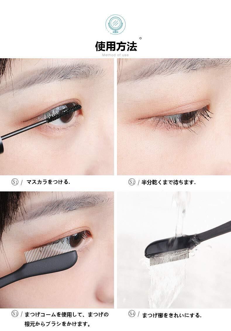 ●ご使用後はコームに残ったマスカラをティッシュ等で拭きとってください。 コームが汚れた場合は、洗剤を薄く溶かしたぬるま湯にしばらくつけてから、歯ブラシ等で洗い流します。●マスカラコームの歯先は非常に細く、刺さると危険です。 ご使用の時は、歯先が刺さらないように、安定した姿勢で、必ず鏡で確認しながら、ぶつからないようにまわりに気をつけて、お使いください。 ●歯先は細く繊細になっております。 強い力を与えると変形するおそれがあります。ご使用にならないとき、携帯されるときは必ず折りたたんでください。 ●お子様の手の届かないところに保管して下さい。