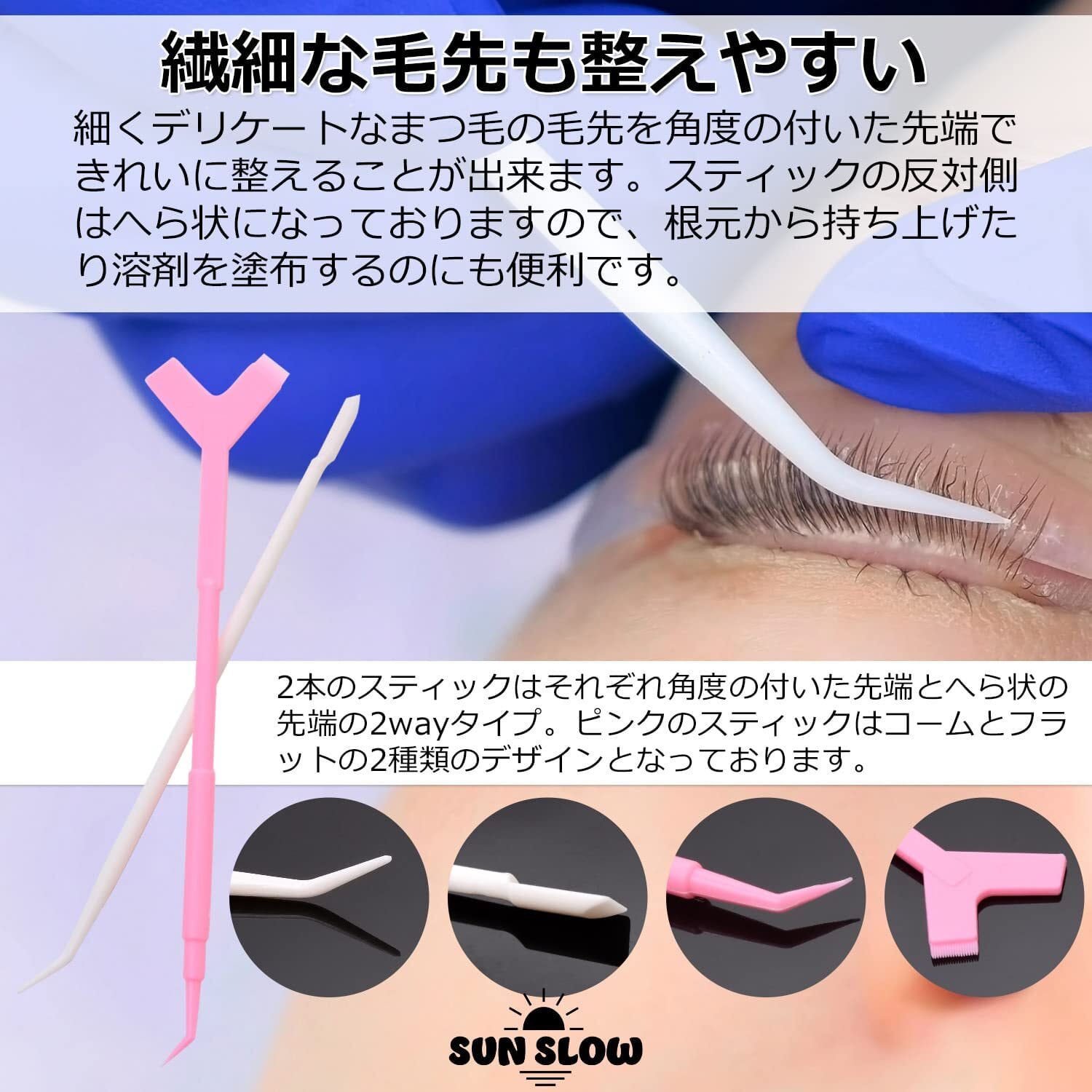 【繊細な毛先も整えやすい!】本製品は2種類のスティックがセットになっており、細くデリケートなまつ毛の毛先を角度の付いた先端できれいに整えることが出来ます。スティックの反対側はへら状になっておりますので、根元から持ち上げたり溶剤を塗布するのにも便利です。用途に合わせて使い分けてください。