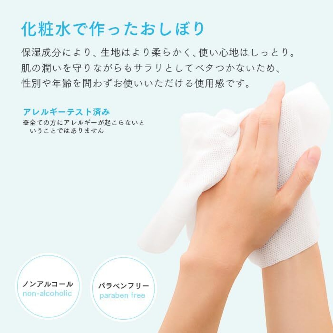 商品特長 ふき取りにより皮膚を清浄にするとともに、保湿剤でうるおいを与えます。手、顔、体など全身に使えます。