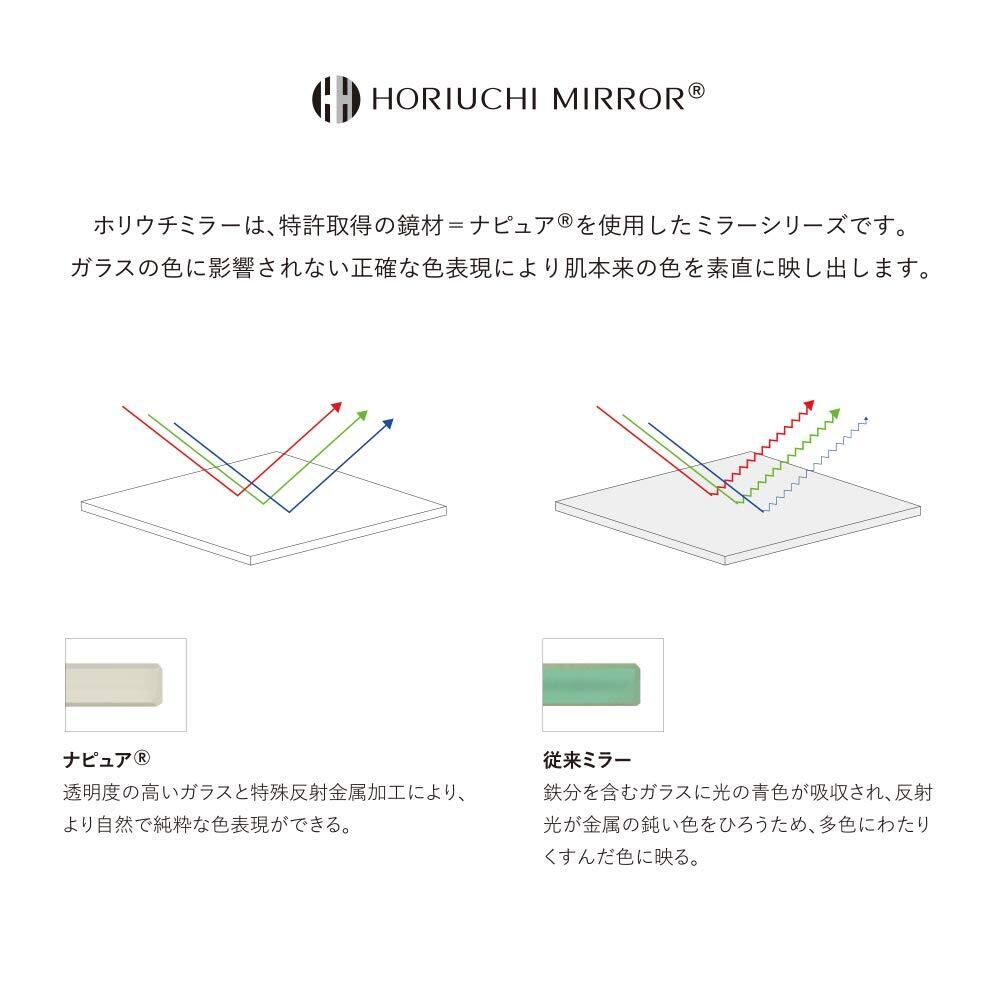 【化粧鏡一筋・安心のMade in Japan】堀内鏡工業は日本の鏡産業の中心地、大阪市平野区で1955年創業致しました。創業以来「身だしなみを整える方へ、正しい道具を提供する」を目的に、取得のミラーを使用し、ユニセックスでエイジレスな鏡製品を開発・製造・販売しています。鏡に映る姿だけではなく、鏡を使っているその姿までをも美しく見せるため、日常の細かな所作や行動の研究を続けています。万が一商品に不具合があった場合ご連絡いただければ速やかに対応させて頂きます。