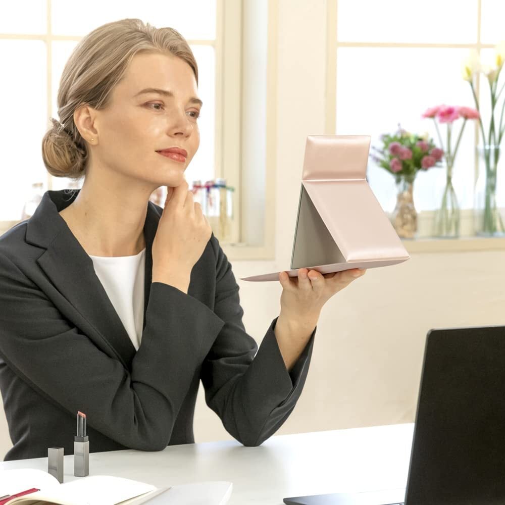 【軽量コンパクト・角度調整可能】お好きな角度でメイクが出来るように角度調整可能なロックラインが付いています。収納時は軽量でコンパクトなので、引き出しやバッグに入れても邪魔になりません。旅行やお出かけ時など持ち運びに便利です。カバーはクッション素材でバッグに入れても割れにくくなっています。サイズ12.5cm×17.5cm、厚み1.5cm、重量約195g