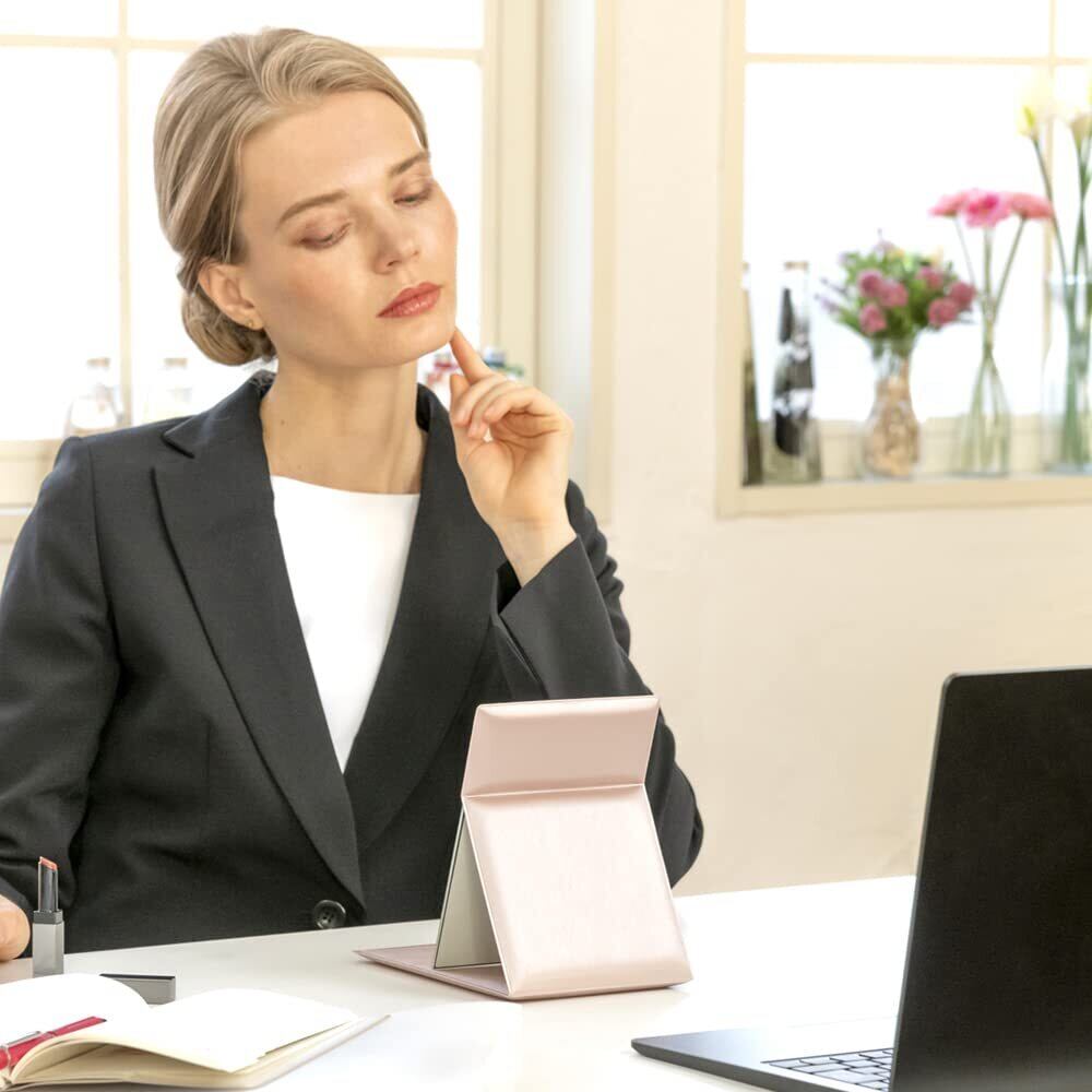 【軽量コンパクト・角度調整可能】お好きな角度でメイクが出来るように角度調整可能なロックラインが付いています。収納時は軽量でコンパクトなので、引き出しやバッグに入れても邪魔になりません。旅行やお出かけ時など持ち運びに便利です。カバーはクッション素材でバッグに入れても割れにくくなっています。サイズ12.5cm×17.5cm、厚み1.5cm、重量約195g