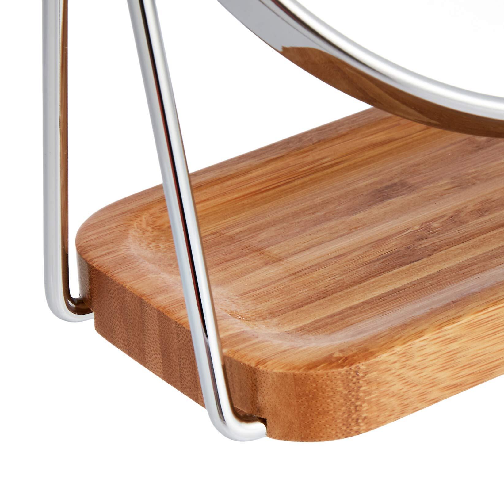 ベーシック 円形 卓上マウント鏡 卓上 バニティ両面ミラー 正方形竹製トレイ付き 倍率 1倍/5倍 ゴールド 19.5 x 8.5 x 21.3 cm