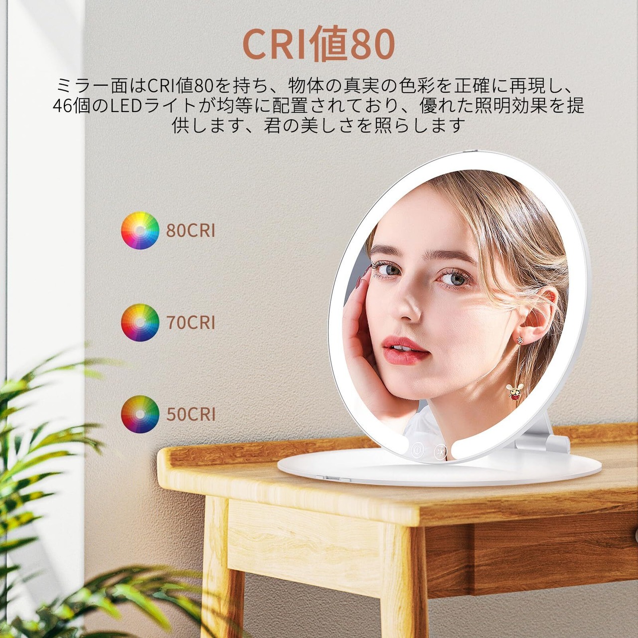 【LEDライト付き&CRI値80】46個のLEDライトが均等に配置されており、優れた照明効果を提供します。ミラー面はCRI値80を持ち、物体の真実の色彩を正確に再現し、化粧の過程で細部までクリアに見ることができます。これらのLEDライトは明るく柔らかな光を提供し、どんな照明条件でも最適なメイクアップ効果を実現します。日常のメイクアップから特別なイベントの繊細なメイクアップまで、プロ級の照明体験をお届けし、完璧で欠点のないメイクアップを実現します。