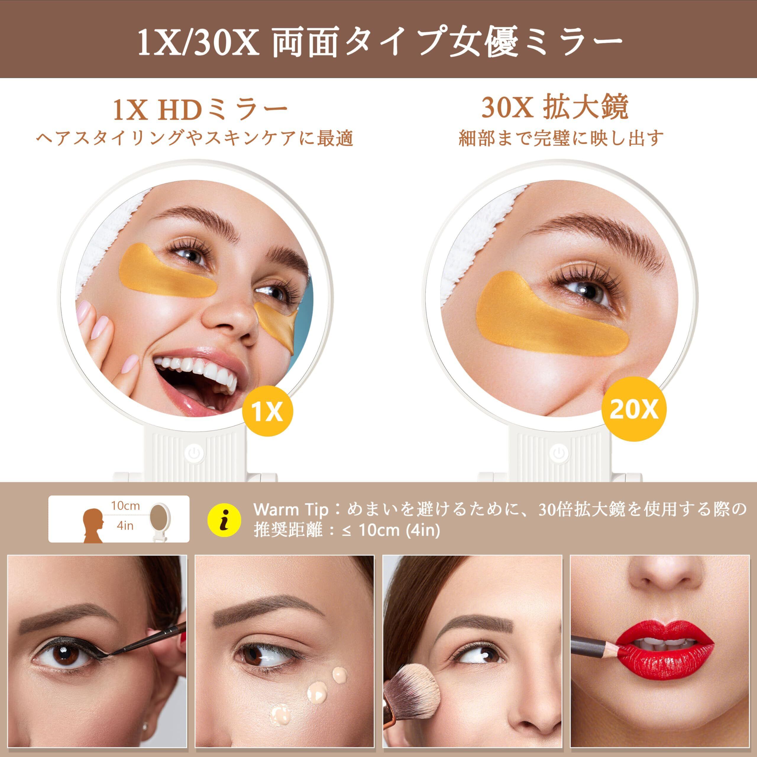 【30倍拡大鏡と等倍鏡】Auxmir女優ミラーは両面タイプで、必要に応じて鏡面を切り替えることができ、日常のスキンケアやメイクに最適です。片面は普通の等倍鏡で、自然な姿を真実に映っています。もう一面は30倍拡大鏡で、毛穴の状態をチェックして、コンタクトレンズを使ったり、アイラインを引いたり、眉を整えたりするなど、細かいなスキンケアを助けることができます。視力の悪い方でも便利にメイクします。 !注意:30倍の拡大鏡は非常に強力で、初めて使用するのは難しいかもしれません。画面の歪みを防ぐために、30倍拡大鏡を使用する場合、距離は10センチ以内が最適です。