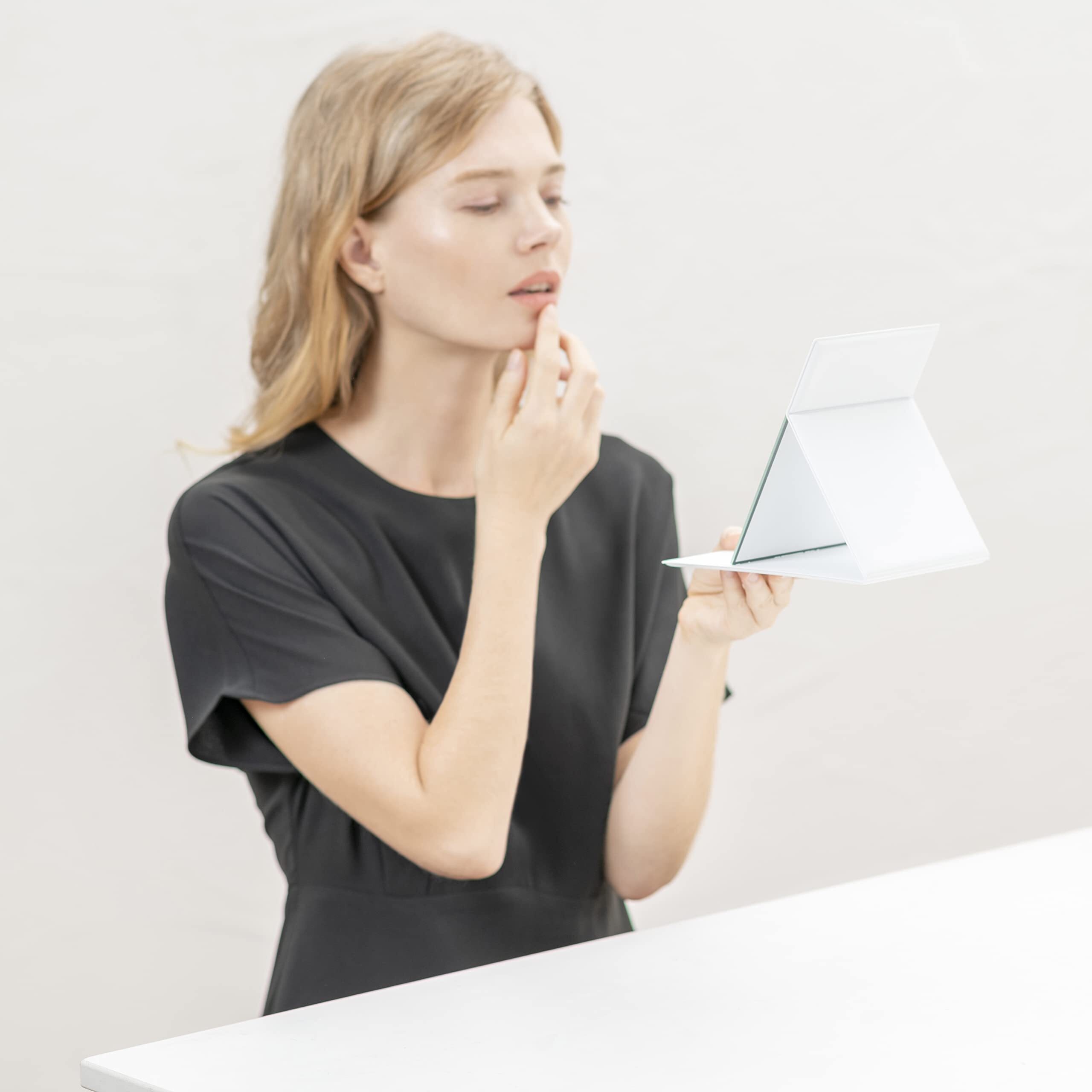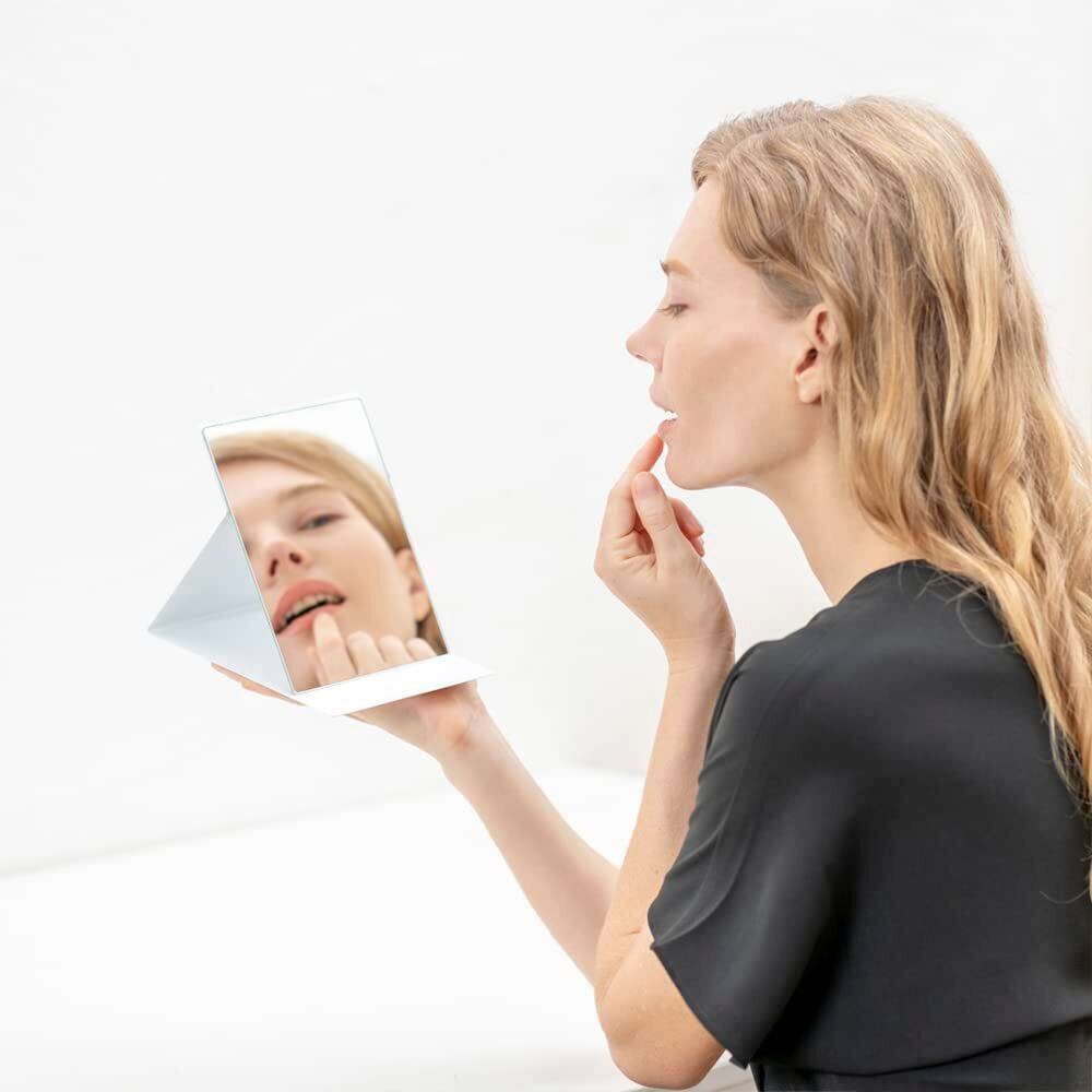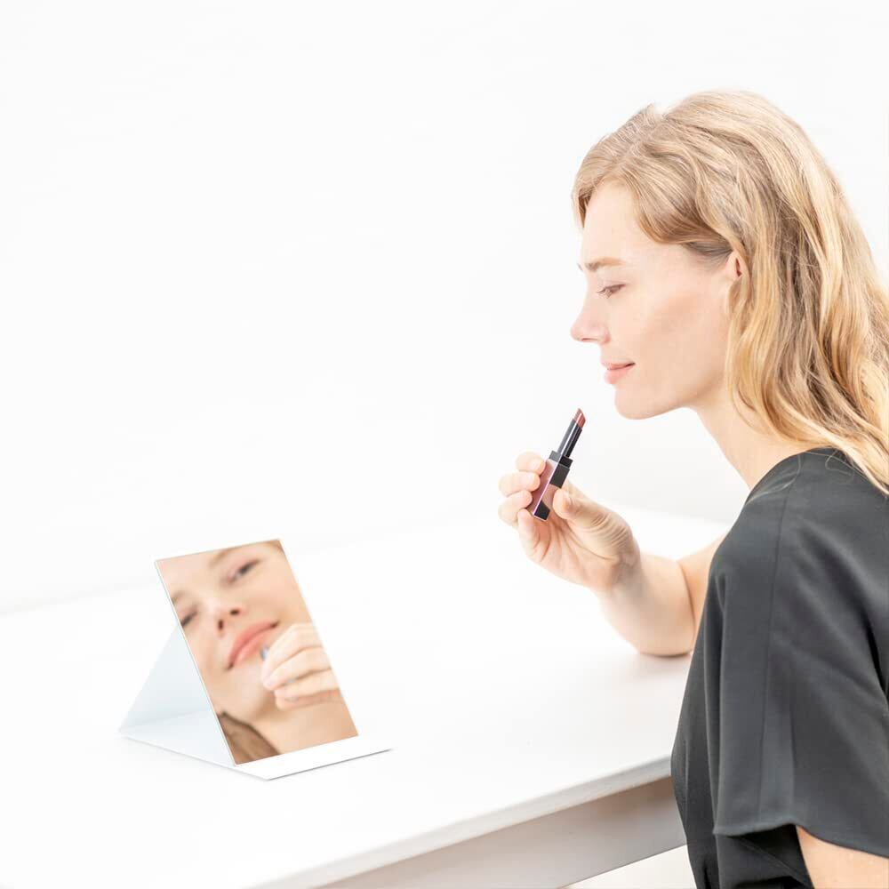 【軽量・コンパクト】従来の折りたたみミラー(当社比)よりも薄く軽いので、場所をとらずコンパクトに収納でき、引き出しやバッグに入れても邪魔になりません。旅行やお出かけ時など持ち運びに便利です。B6サイズの手帳と同じサイズ感で、バックに入れてもかさばらず、外出先でのメイク直しに便利です。サイズ12.5cm×17.3cm、厚み0.85cm、重量約200g