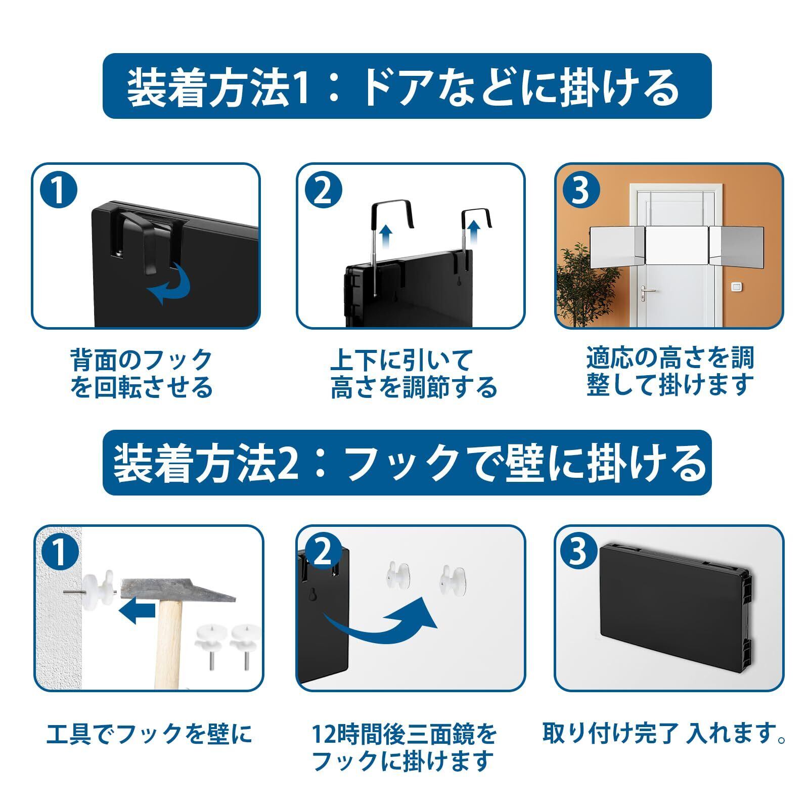 【完璧なサイズ】セット内容: 三面鏡*1、5倍拡大鏡*1。伸縮アームのデザインが便利で、折り畳むことができ、見た目の割に軽くて、ドアにぶら下げても安心して使えます。この鏡があれば、バリカンで簡単カットし、毛染めも出来ます。 時間とお金を自分の好きなことに使うことができます。化粧鏡は誕生日プレゼント、記念日プレゼント、家族、妻、夫、友人へのクリスマスプレゼントとして贈ります。