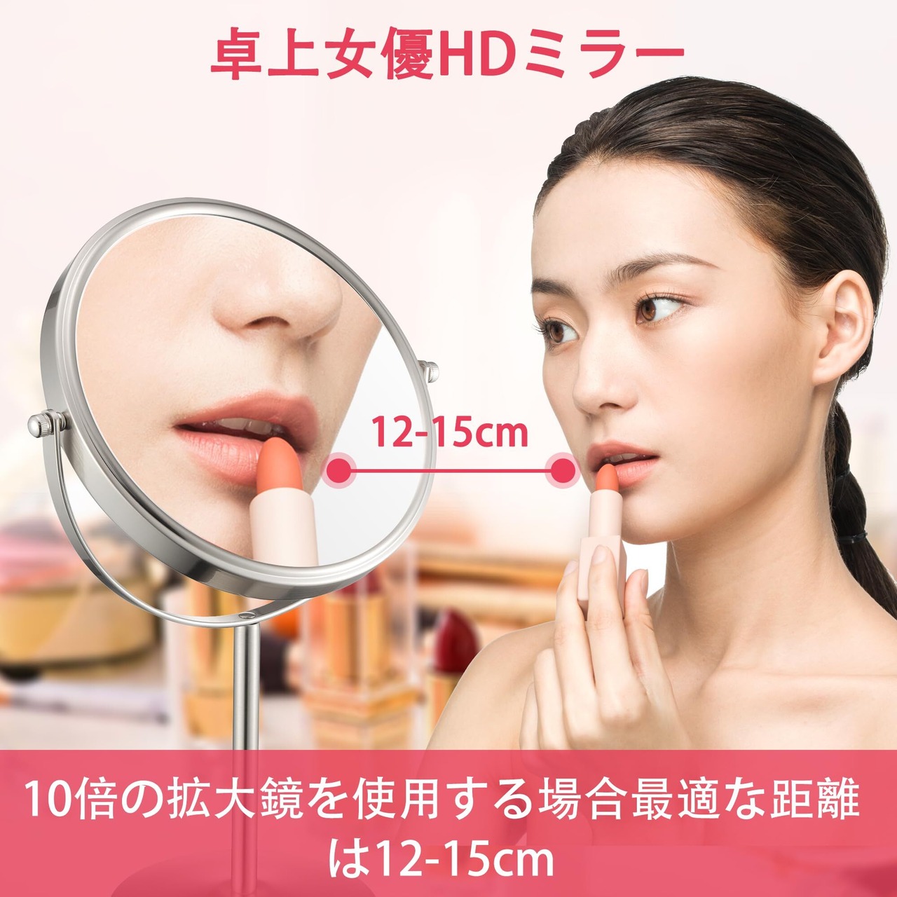 【等倍鏡&10倍拡大鏡】1つのスタンドミラーで2つのニーズをクリアし、必要に応じて鏡面を切り替えて、日常のスキンケアやメイクを完成させることができます。片面は普通の等倍鏡で、全体の顔効果をリアルに反応させることができます。もう一方の面は10倍鏡で、顔の特徴を拡大し、コンタクトレンズを使ったり、アイラインを引いたり、眉を整えたりするなど、精密な美容ケアを助けることができます。近視や老眼の人にも便利に使えます。注意:画面の歪みを防ぐためには、10倍拡大鏡を使用する場合、距離は12~15センチが最適です。