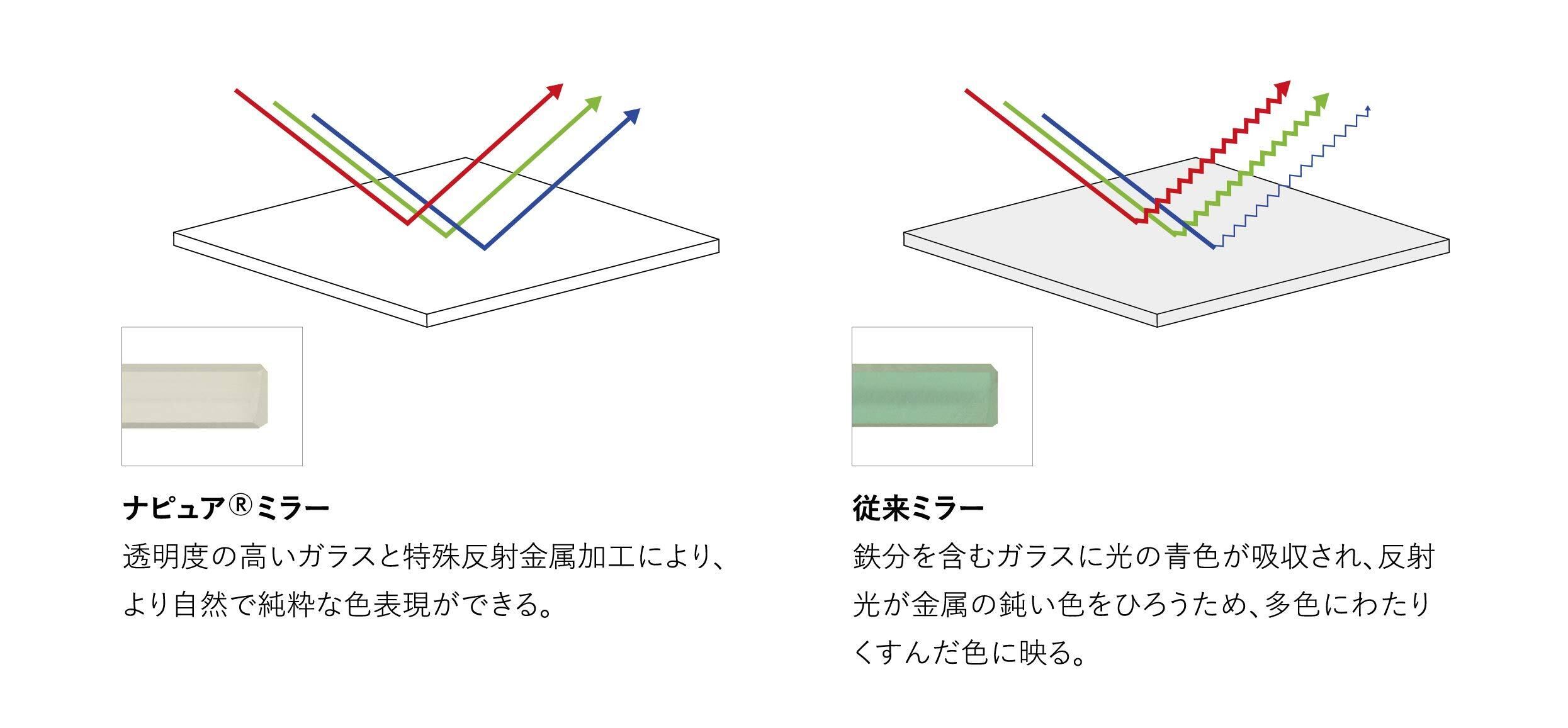 【正しい肌色を映し出すのミラー】HORIUCHI MIRRORが開発したナピュアミラーは、くすみの原因となる鉄分をより多く取り除いた透明度の高いガラスと、色の再現性が高い反射金属との組み合わせにより、本来の姿をありのままに映し出すを取得したミラーです。(番号:PAT3732490) 肌の色が鮮明に映ることで、自分に合ったファンデーションの色味がわかり、メイクの仕上がりが格段よくなるため、美容業界のプロの方々にも支持されています。また有害な鉛成分を全く含まない、人と環境にやさしいミラーです。
