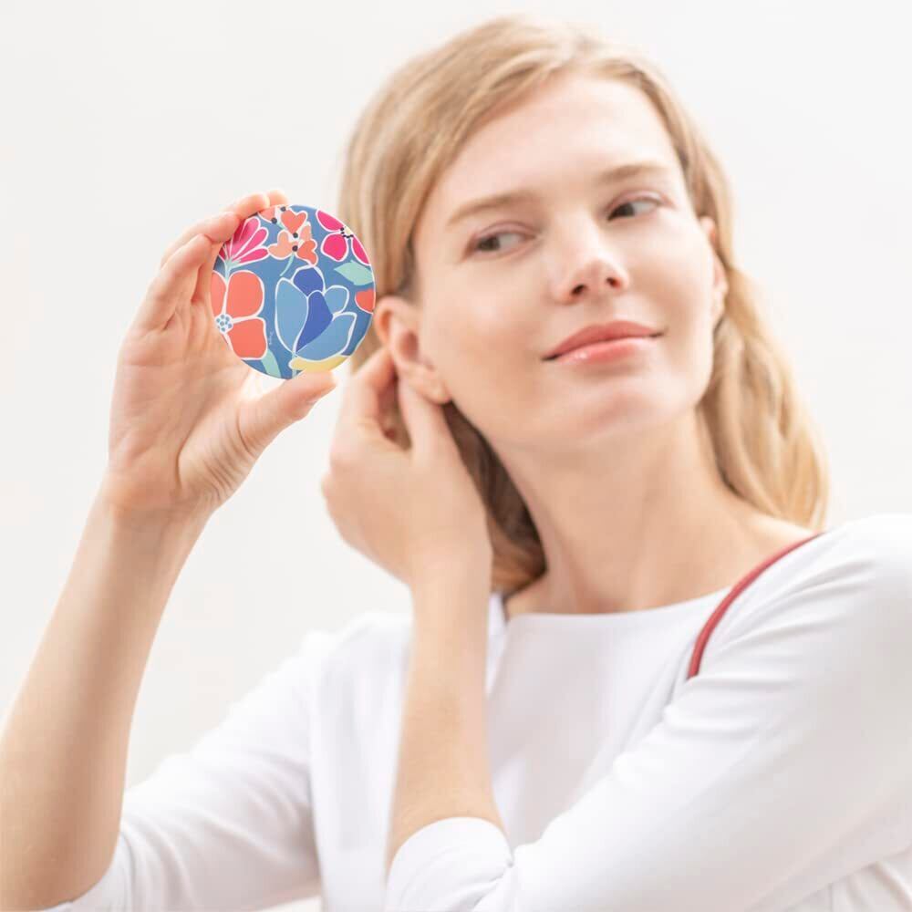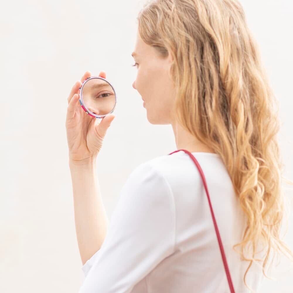 【軽量・コンパクト】ピーマン1個分くらいのお重さ(33g)なので、とても軽量です。持ちやすく腕が疲れません。コンパクトなので、ポケット・ポーチ・バッグに入ります。二つ折りタイプではないのでポーチから出して直ぐに見られるのが便利です。全体サイズ:約75mm丸 厚み5mm 重量:約33g