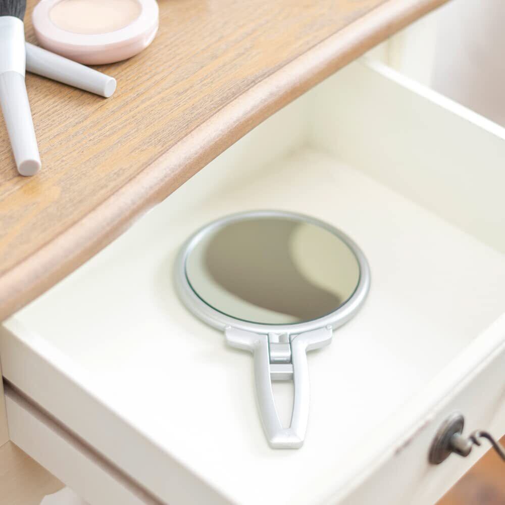 【折立可能】持ちやすい取手がついているので、ハンドミラーとして使いやすいです。重量は約145gと軽量で、腕が疲れにくいです。折立てれば卓上ミラーとしても使用できます。玄関などのちょっとした所にも置けて、お出かけ前のお顔のチェックに便利です。コンパクトなので、引き出しやカバンに入れても邪魔になりません。旅先などに、持ち運びがカンタンです。全体サイズ:約123mm x 210mm x 10mm 重量:約145g