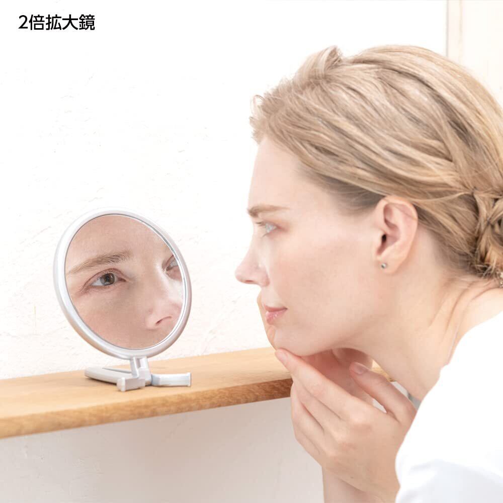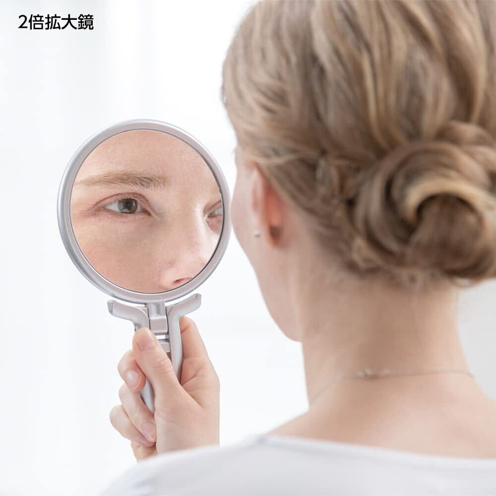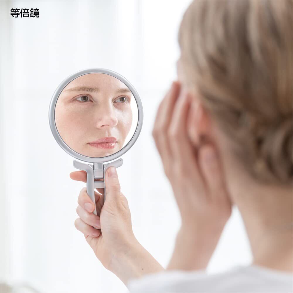 【2倍拡大鏡】等倍鏡と2倍拡大鏡がセットになった両面ハンドミラーです。2倍拡大鏡は細部まで大きく見えて角栓・シミ・シワなどお肌のお手入れに最適です。また、コンタクトレンズの装着の時にも役立ちます。