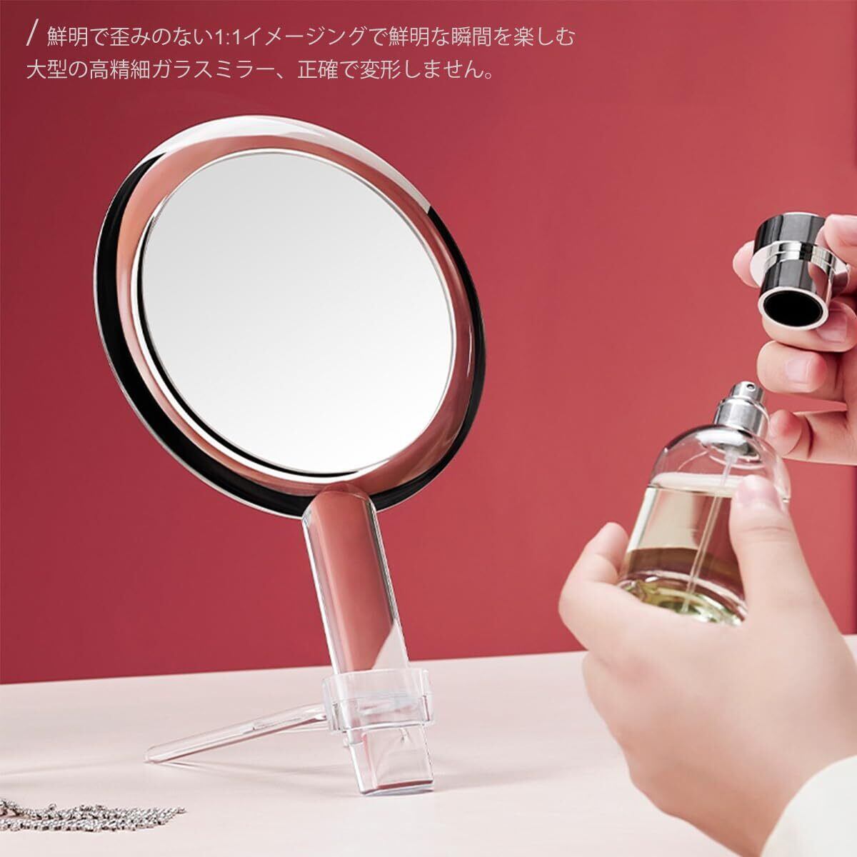 【ハンドヘルドおよびデスクトップのデザイン】この手鏡には追加のスタンドデザインがあり、テーブルの上に立てて卓上ミラーとして使用できます。フレキシブルブラケットでミラーの立ち角度を調整できます。メイクをはっきりと便利に見ることができます。スタンドを外すと手鏡になります。