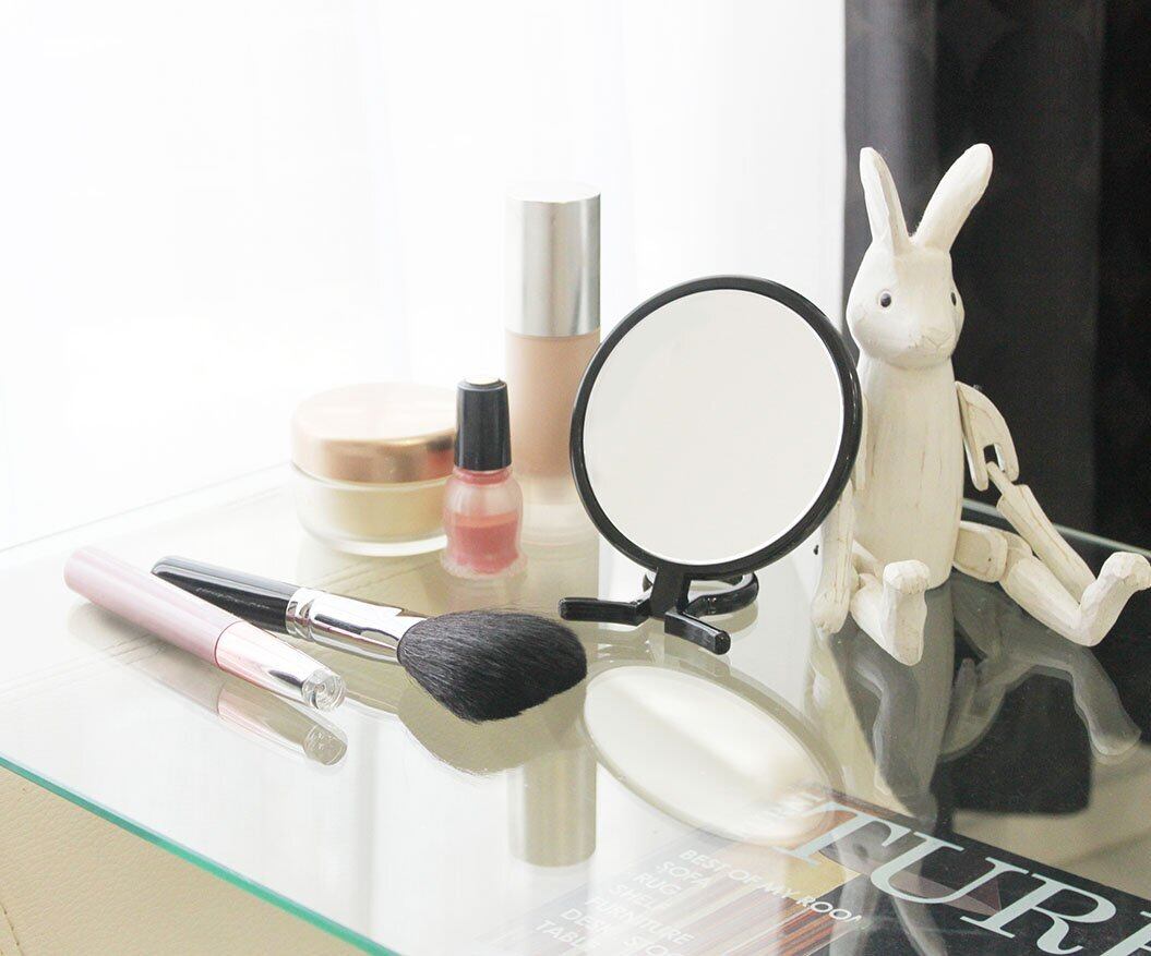 手に持っても立てても、スキンケアやメイク直しに重宝する折立タイプのハンドミラーです。