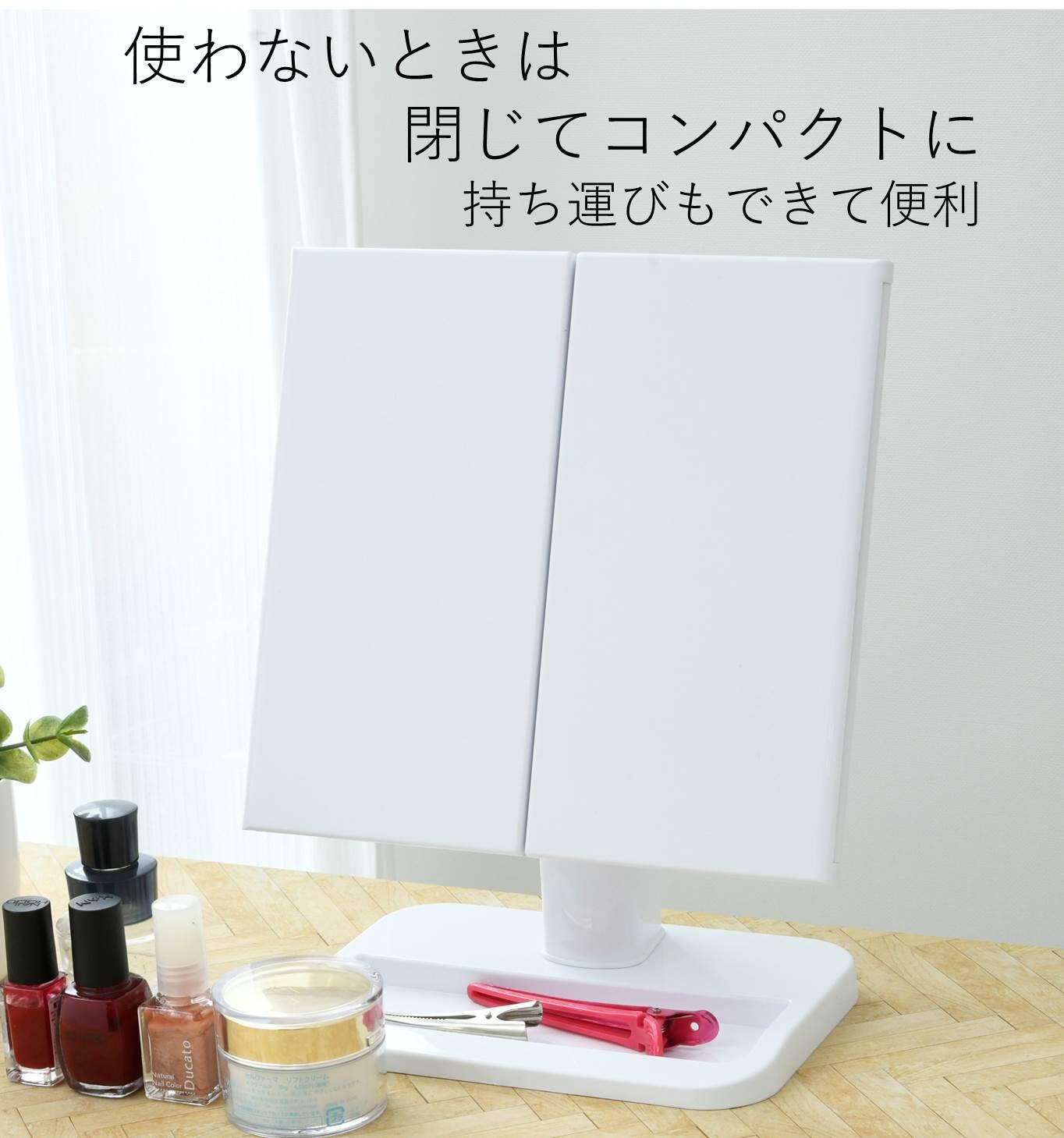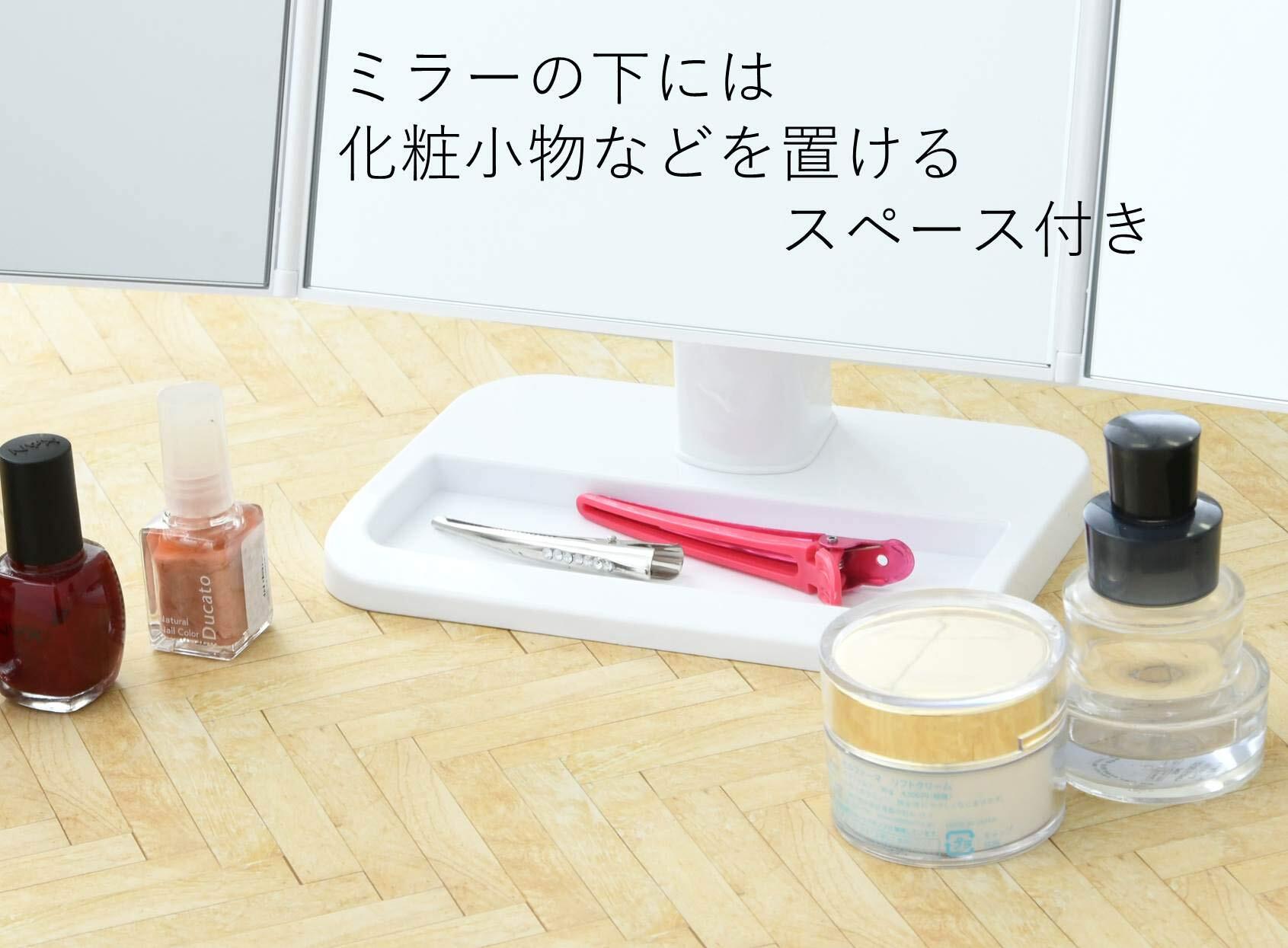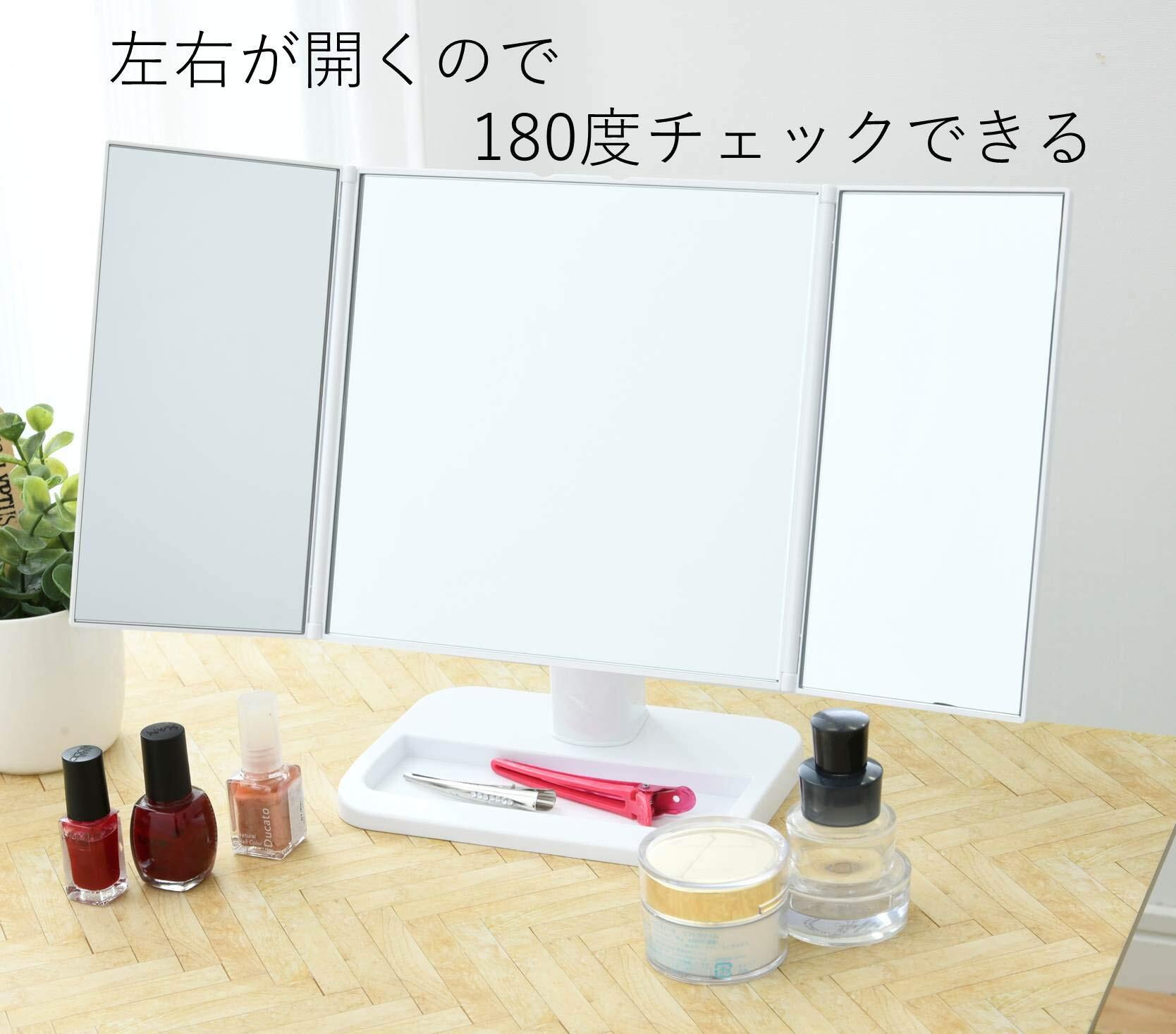 ●左右のミラーが開閉して見やすい卓上三面鏡●脚部にはお化粧道具の収納スペース付き●持ち運びも簡単でどこでも使えます