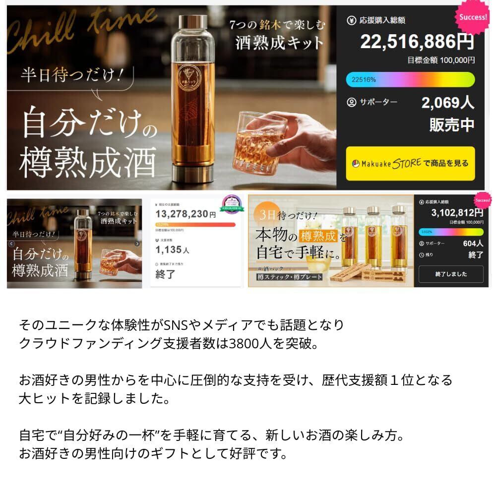 お好みの期間熟成: 熟成キットボトルにウイスキーや焼酎を入れて数時間~数日間置くと、ウイスキーが琥珀色に変わり香味が変化します。ニューメイクを入れてもおすすめです