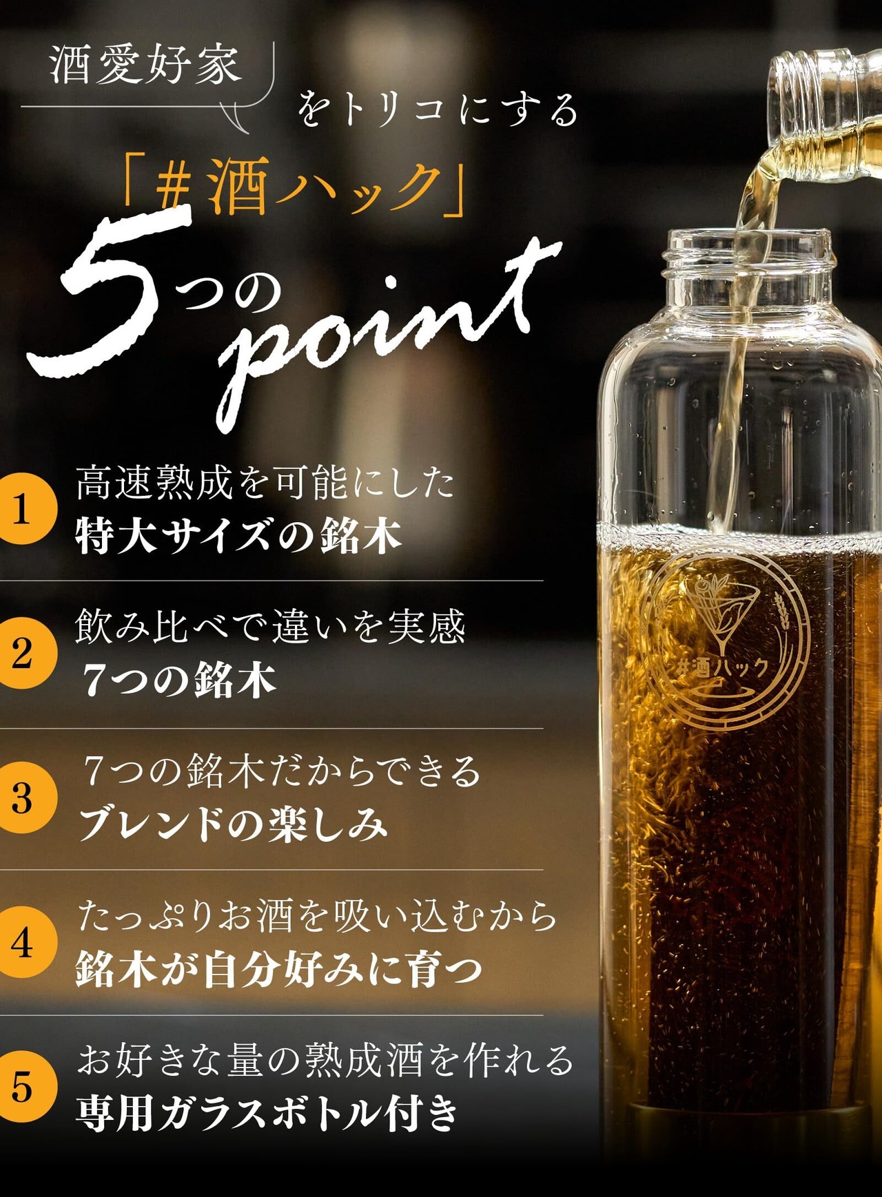 オーク樽で作られるのが主流だったウイスキーですが、日本では1940年代からミズナラ樽でのウイスキー生産が始まりました。 当初は木の香りが強く、なかなか良い味が出なかったそうですが、数々の挑戦と調整を進めながら、ミズナラ樽で作ったウイスキーは今や日本を代表するものとなりました。 しかしながら、ミズナラは成長が遅く、樽にする条件は樹齢200年以上のものと、高級と言われているオーク樽よりも高級品と言われています。 そんなミズナラを安価にご自宅で楽しめるのが、この商品です。ぜひ、お好みの熟成方法を編み出してお楽しみください。