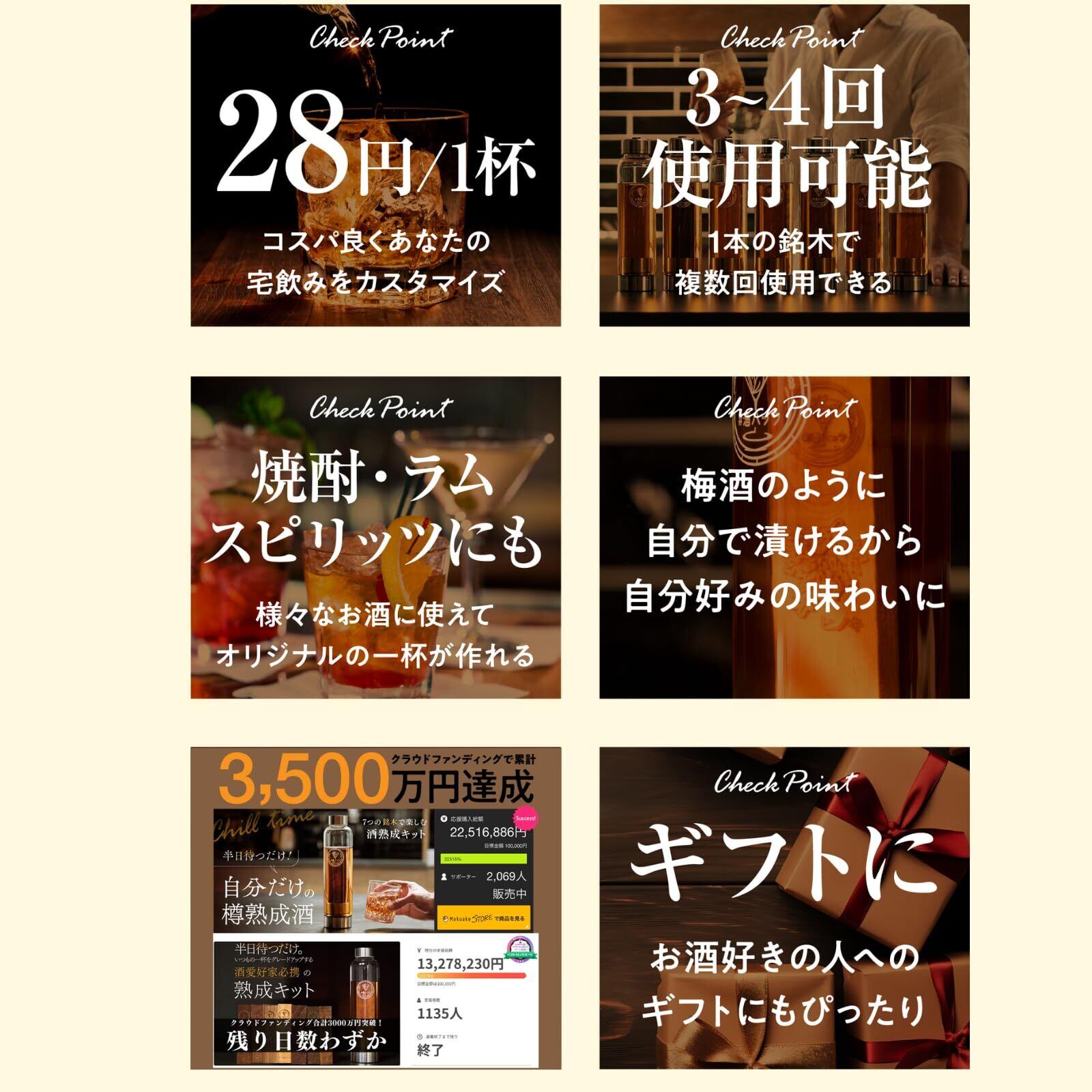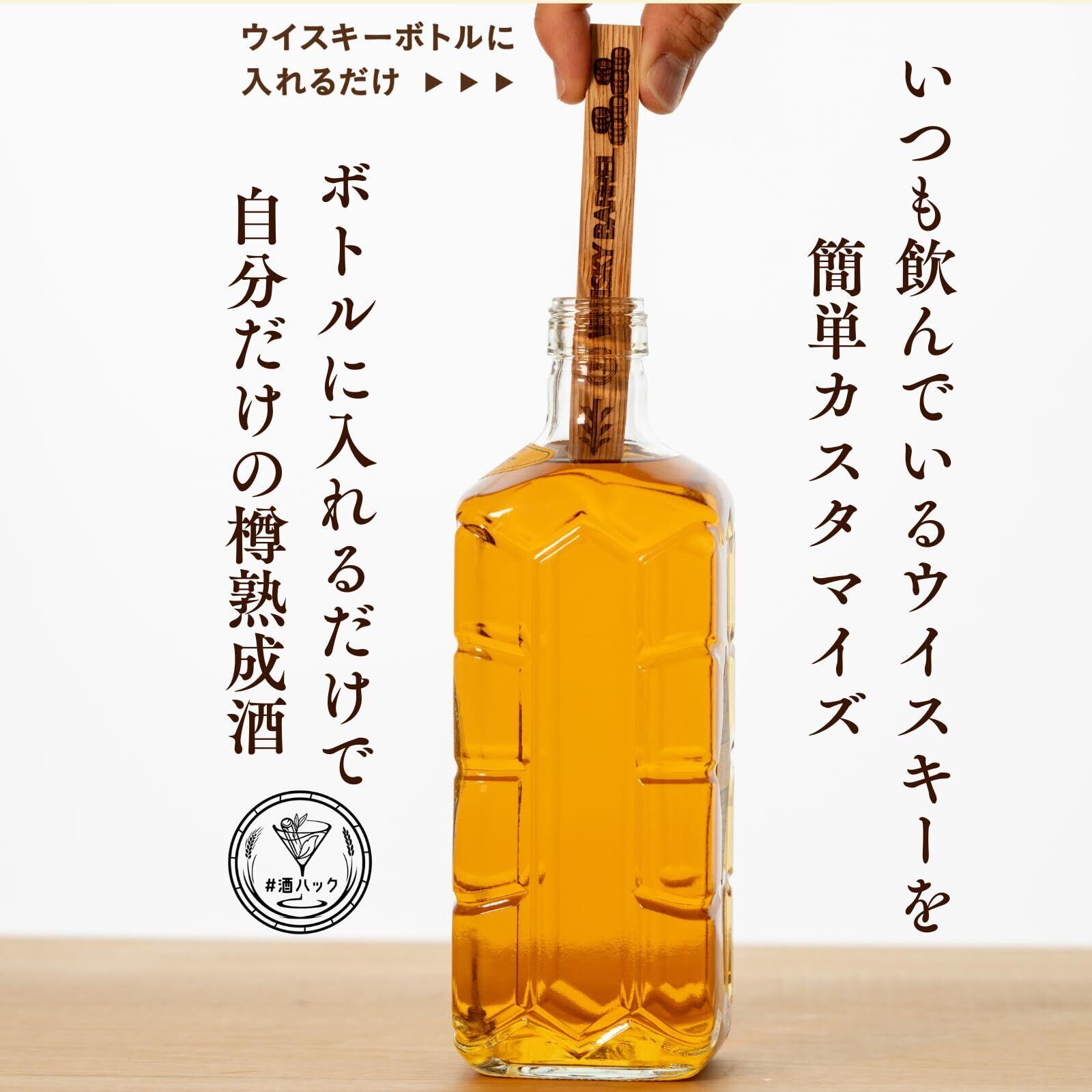 銘木スティックをお酒のボトルにそのまま入れて、なんと数日待つだけで、いつものお酒が樽で熟成したようなまろやかさと豊かな香りに!お酒好きが開発した、お酒好きなあなたのためのキットです。