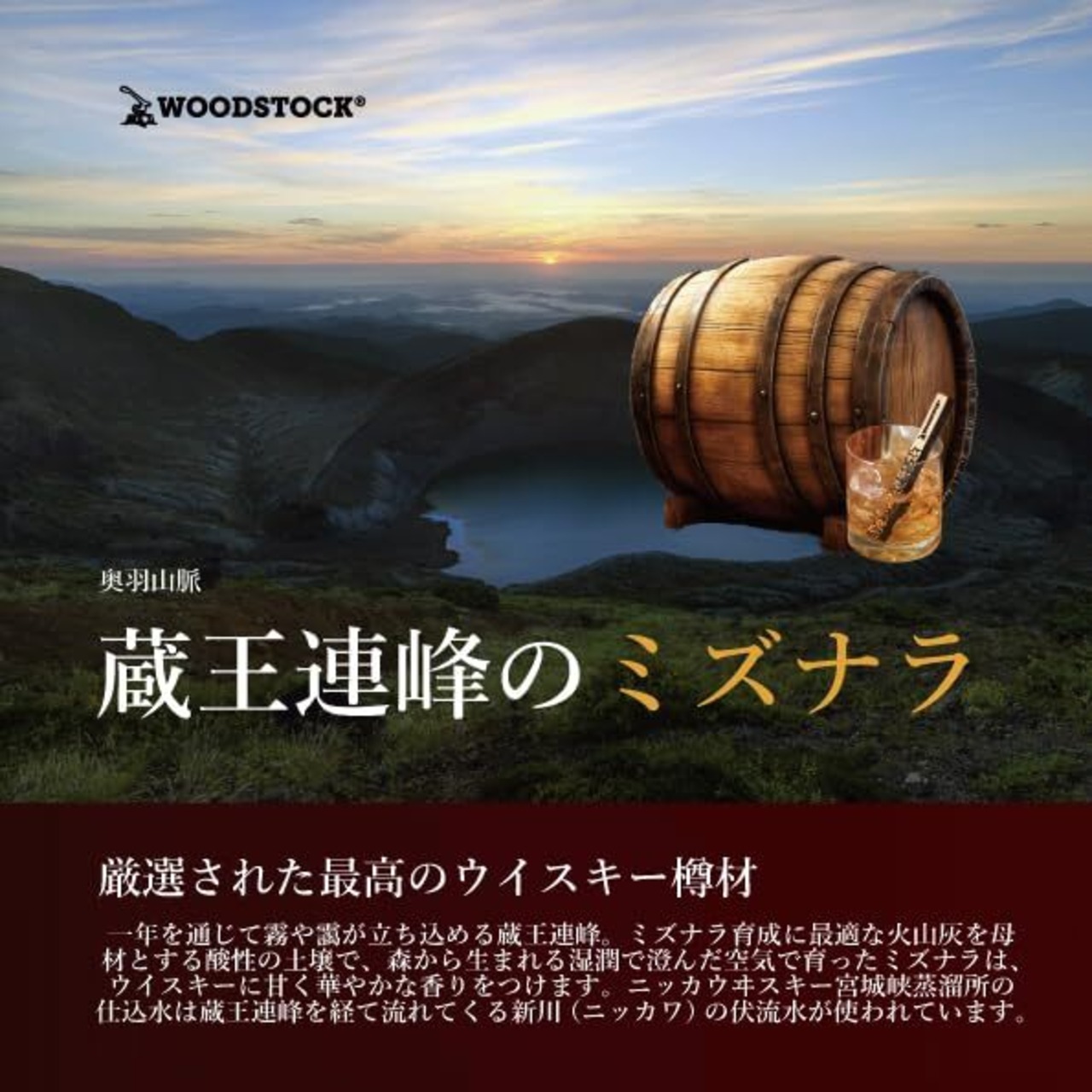 熟成を促進: 蔵王連峰から吹き降ろす風「蔵王おろし」のもと、天日で1-2年しっかりと乾燥したミズナラは、お酒に入れるとたっぷりと呼吸し、熟成を促します