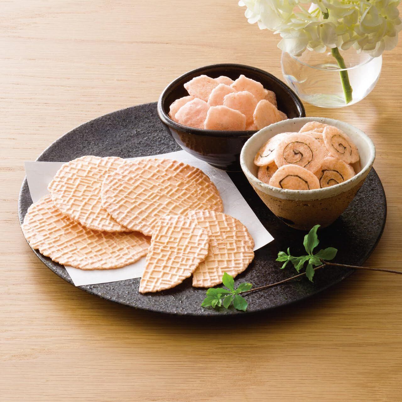 赤えびせんべい(1枚入)×5、えびせん(うず巻き・えび松風)10g×各1